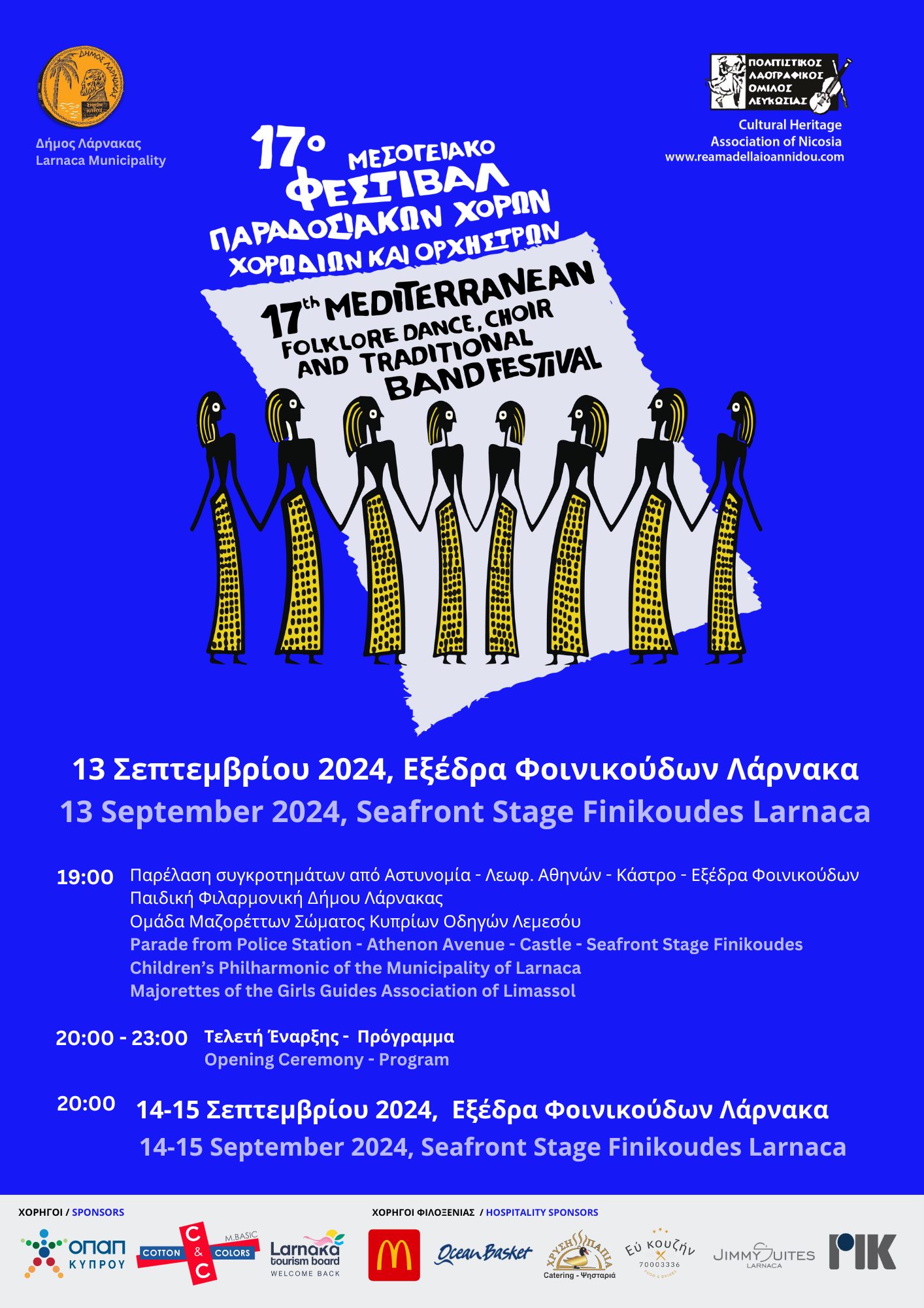 Το Φεστιβάλ τελεί υπό την αιγίδα του Έντιμου Δημάρχου Λάρνακας κ. Ανδρέα Βύρα, ο οποίος θα κηρύξει την έναρξη του στις 13/9/2024 και ώρα 20:00 στην εξέδρα των Φοινικούδων. Της τελετής έναρξης και του προγράμματος θα προηγηθεί μεγάλη παρέλαση των συγκροτημάτων με αφετηρία τον Κεντρικό Αστυνομικό Σταθμό Λάρνακας – Λεωφόρο Αθηνών (παραλιακή οδός) και τέρμα την Εξέδρα Παραλίας (Φοινικούδες) όπου θα γίνουν οι παραστάσεις. Κατά την τελετή έναρξης θα τιμηθούν όλοι οι χορηγοί που για 17η συνεχή χρονιά προσφέρουν οικονομική και ηθική στήριξη στους διοργανωτές.