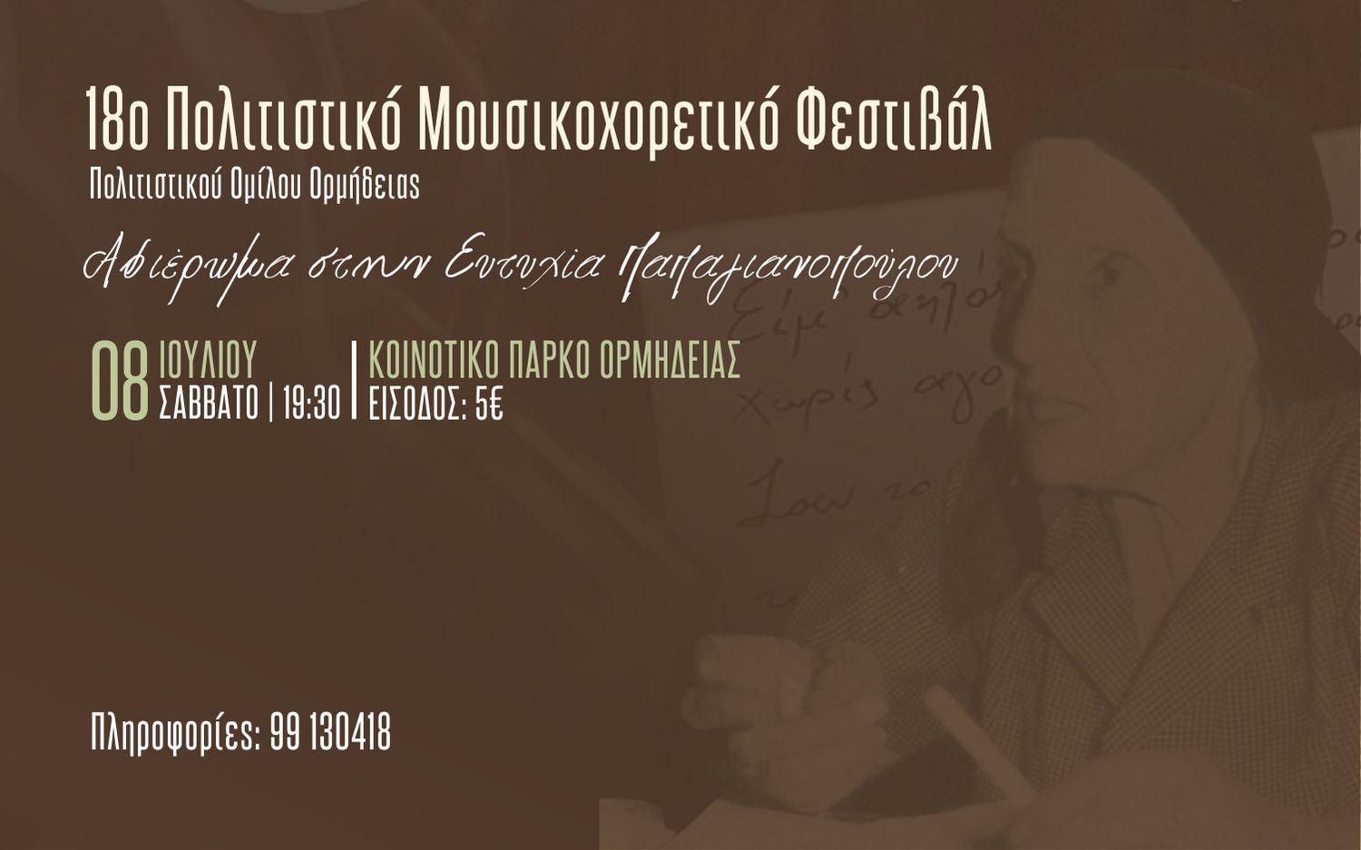 Ο Πολιτιστικό Όμιλος Ορμήδειας ανακοινώνει τη διοργάνωση του 18ου Πολιτιστικού Μουσικοχορευτικού Φεστιβάλ του, με αφιέρωμα στο έργο της εμβληματικής στιχουργού, Ευτυχίας Παπαγιαννοπούλου, το Σάββατο, 08 Ιουλίου 2023 στο Κοινοτικό Πάρκο Ορμήδειας στις 19:30.