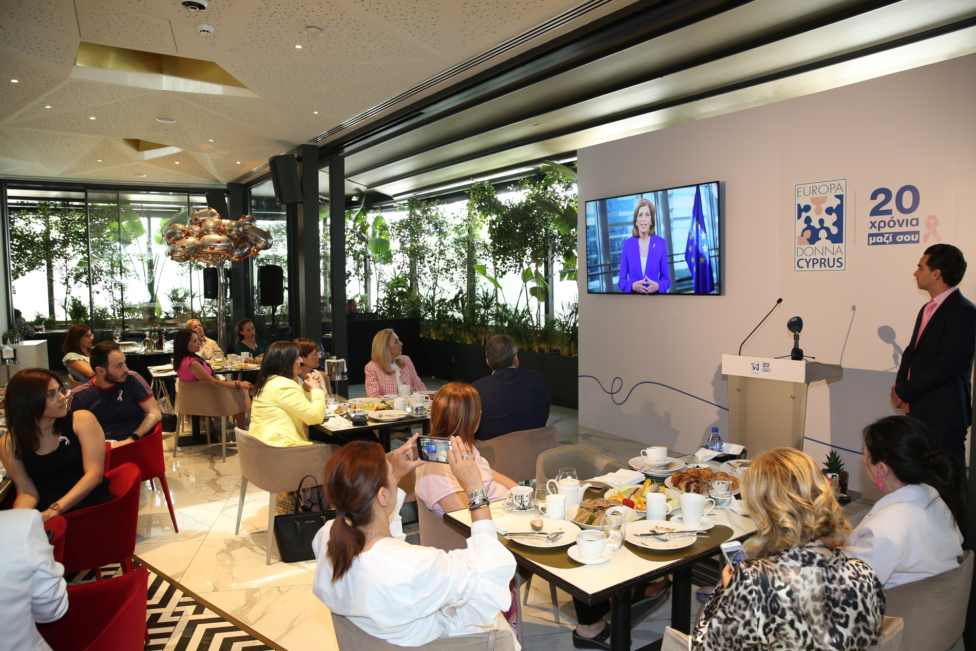 Στο δικό της χαιρετισμό, η Επίτροπος της Ε.Ε. για την Υγεία και την Ασφάλεια των Τροφίμων, και ιδρυτικό μέλος της Europa Donna Κύπρου, Στέλλα Κυριακίδου, αναφέρθηκε στους αγώνες και την προσφορά της Europa Donna Κύπρου όλα αυτά τα χρόνια, στέλνοντας παράλληλα μήνυμα στήριξης και εστιάζοντας στο δικαίωμα των καρκινοπαθών στη λήθη, το οποίο αποτελεί δράση που εντάσσεται στο Ευρωπαϊκό Σχέδιο για τον Καρκίνο. «Το Ευρωπαϊκό Κοινοβούλιο έχει ταχθεί υπέρ αυτού του δικαιώματος μέσα από σχετική έκθεση με την οποία καλεί τα κράτη μέλη να το εντάξουν στην εθνική τους νομοθεσία. Επιπρόσθετα, ζητά όπως το αργότερο μέχρι το 2025, όλα τα κράτη μέλη να εγγυούνται το δικαίωμα στη λήθη για όλους τους καρκινοπαθείς, 10 χρόνια μετά το τέλος της θεραπείας τους και 5 χρόνια μετά αν διαγνώστηκαν πριν τα 18 τους», ανέφερε η Ευρωπαία Επίτροπος.