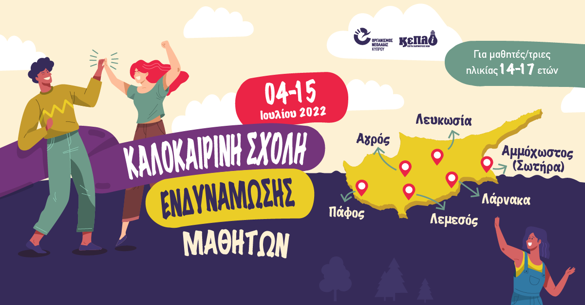 Για 7η συνεχόμενη χρονιά, τα Κέντρα Πληροφόρησης Νέων του Οργανισμού Νεολαίας Κύπρου διοργανώνουν την Καλοκαιρινή Σχολή Ενδυνάμωσης Μαθητών, για παιδιά ηλικίας 14-17 ετών. Η φετινή Σχολή, η οποία θα γίνει με φυσική παρουσία, θα πραγματοποιηθεί από τις 4 μέχρι τις 15 Ιουλίου, σε όλα τα Κέντρα Πληροφόρησης Νέων Παγκύπρια (Δευτέρα-Παρασκευή, από τις 09:00-13:30). Ανάμεσα στις δραστηριότητες που έχουν προγραμματιστεί, είναι εργαστήρι φωτογραφίας, δημιουργία βίντεο από smartphone, μαγειρική – διατροφή, εργαστήρι για περιβαλλοντικά θέματα, εκπαιδευτικές εκδρομές και πολλά άλλα. Όλες οι δράσεις πραγματοποιούνται υπό την εποπτεία και την καθοδήγηση έμπειρων εκπαιδευτικών. Μέσα από τις δραστηριότητες αυτές, τα παιδιά θα αποκτήσουν νέες δεξιότητες, χρήσιμες στην καθημερινότητά τους, ενώ θα γνωρίσουν και άλλα παιδιά της ηλικίας τους.