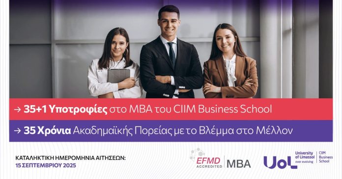 Το Πανεπιστήμιο Λεμεσού (UoL), συνεχίζοντας την 35χρονη ακαδημαϊκή πορεία του CIIM – Cyprus International Institute of Management, ανακοινώνει τη χορήγηση 35+1 υποτροφιών για το Μεταπτυχιακό Πρόγραμμα στη Διοίκηση Επιχειρήσεων (MBA), με αφορμή την ιστορική μετεξέλιξή του και την επίσημη μετονομασία της Σχολής σε CIIM Business School.