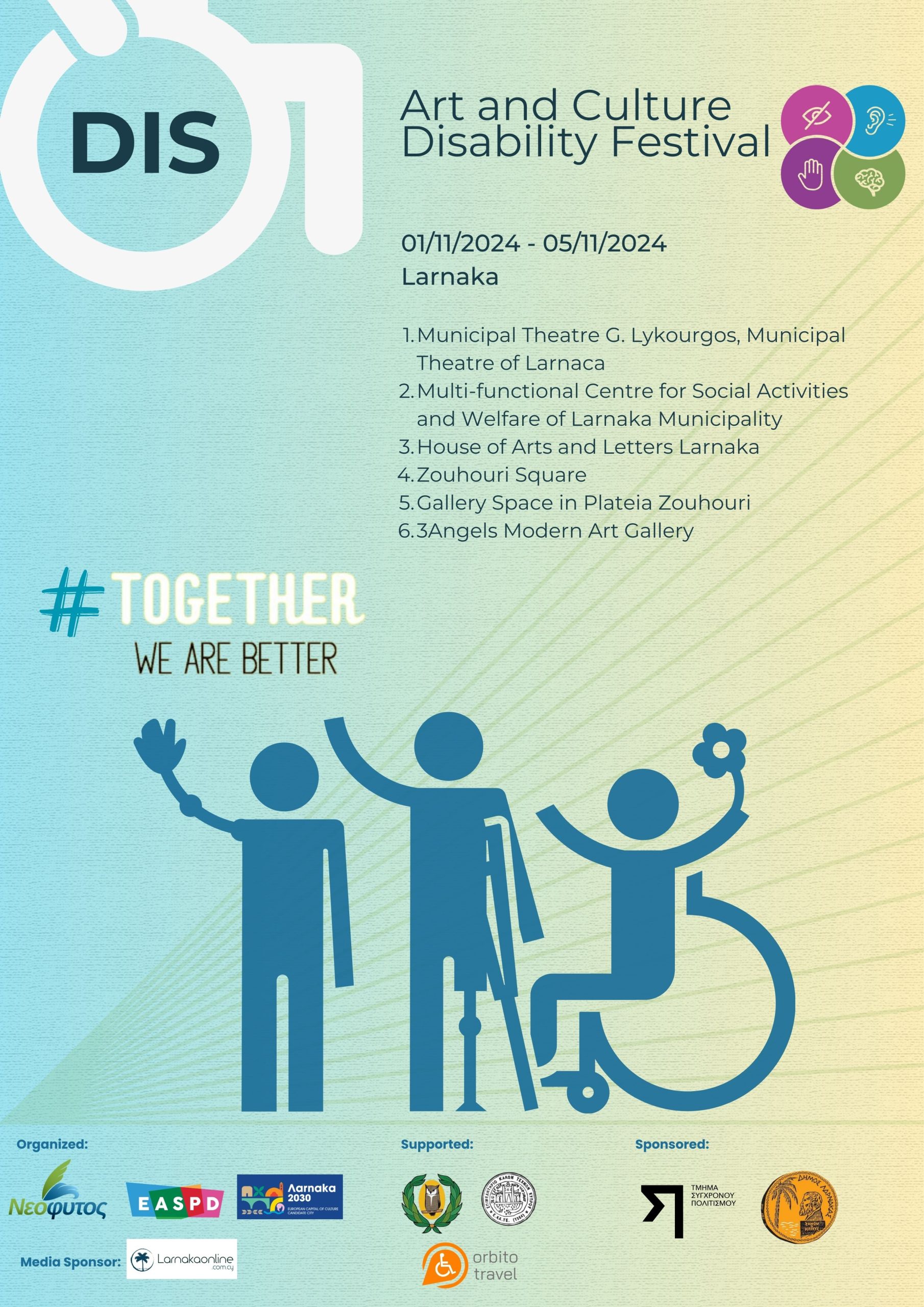 Το Πρώτο Ευρωπαϊκό Φεστιβάλ Τέχνης και Πολιτισμού Αναπηρίας DIS θα πραγματοποιηθεί από την 1η έως τις 5 Νοεμβρίου 2024 στη Λάρνακα, μια πόλη που φημίζεται για την πλούσια πολιτιστική της κληρονομιά και τη ζωντανή της κοινότητα. Συνδιοργανώνεται από την Οργάνωση Πολιτισμού «Νεόφυτος», την EASPD και την Πολιτιστική Πρωτεύουσα 2030 Λάρνακα, με την υποστήριξη του Δήμου Λάρνακας, του Υπουργείου Παιδείας, Νεολαίας και Αθλητισμού και του Υφυπουργείου Πολιτισμού Κύπρου.