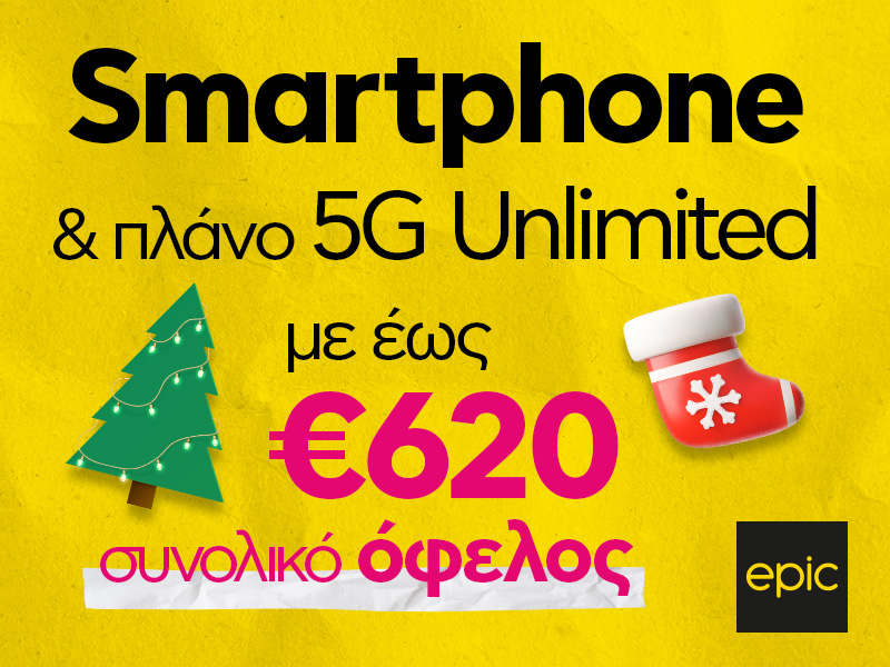 Αυτά τα Χριστούγεννα, μη συμβιβαστείς με τα δώρα σου! Απόκτησε το νέο σου smartphone από €0 αρχικά και με πλάνο 5G Unlimited, μεταφέροντας τον αριθμό σου στην Epic.