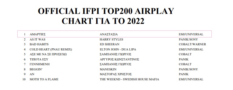 Η 19χρονη λαϊκή τραγουδίστρια κατάφερε με το ντεμπούτο single της να ξεπεράσει τον ανταγωνισμό και να κατακτήσει το Νο1 τραγούδι της χρονιάς στα ελληνικά ραδιόφωνα, τόσο στο μικτό όσο και στο ελληνικό chart. Το viral τραγούδι του 2022 βρέθηκε το περασμένο καλοκαίρι για 6 εβδομάδες στο Νο1 του ραδιοφωνικού airplay, ενώ παρέμεινε στο Top10 για 30 συνεχόμενες εβδομάδες σπάζοντας ρεκόρ παραμονής στο chart για πρωτοεμφανιζόμενη τραγουδίστρια.