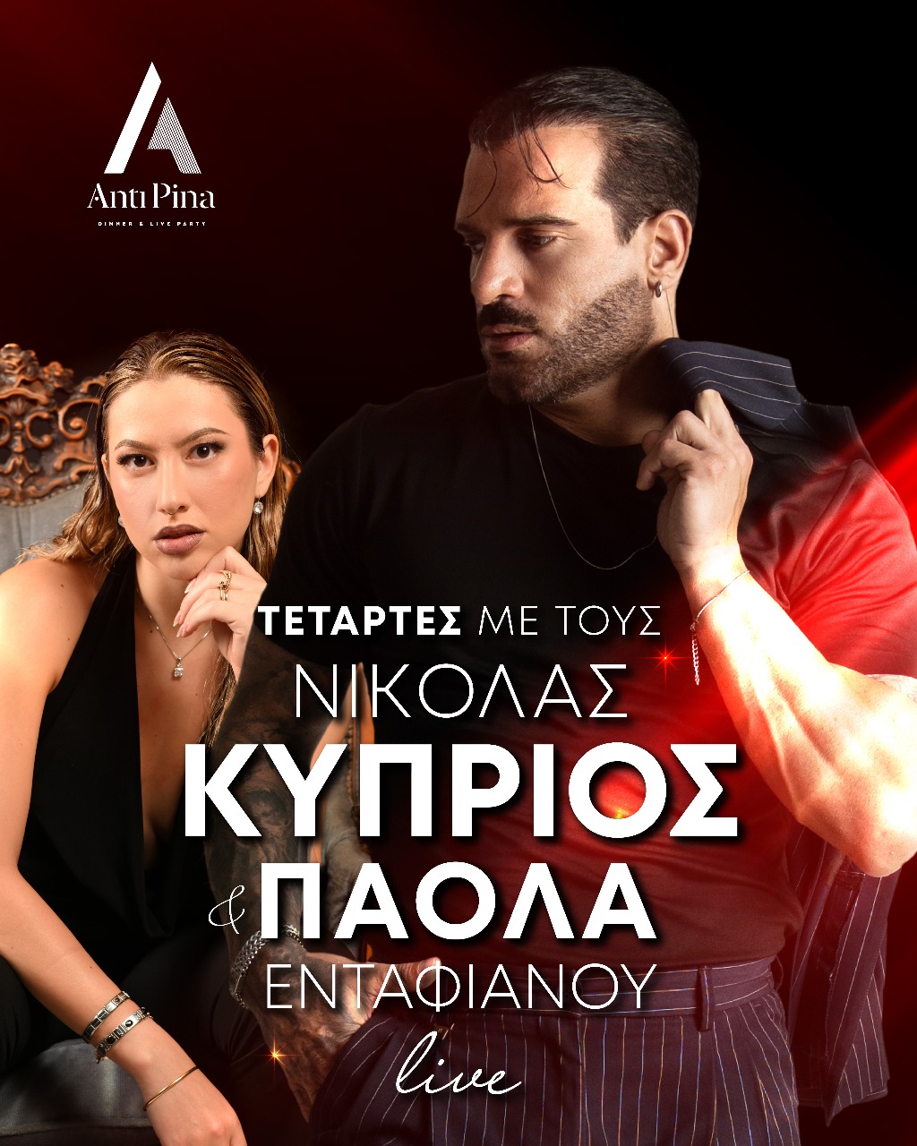 Το αγαπημένο spot της πρωτεύουσας Antipina επιστρέφει ανανεωμένο και πιο εντυπωσιακό από ποτέ, παρουσιάζοντας το “Antipina Dinner Live Party”, μια εμπειρία που συνδυάζει εκλεκτή γαστρονομία με εκρηκτική ζωντανή διασκέδαση. Από αυτή την Τετάρτη, 19 Νοεμβρίου, η Λευκωσία γεμίζει ρυθμό, ενέργεια και γεύση, καθώς κάθε εβδομάδα το Antipina προσφέρει στο κοινό δύο μοναδικές βραδιές που δεν πρέπει να χάσετε.