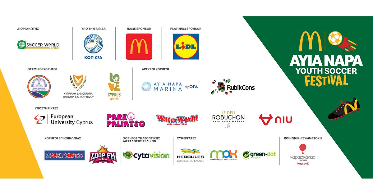 Τέλος, θα ήταν παράλειψη μου να μην ευχαριστήσω όλους ανεξαίρετος τους χορηγούς και υποστηρικτές της διοργάνωσης μας, και ιδιαίτερα την McDonald’s Cyprus για την πολύ σημαντική για την διοργάνωση χορηγική συμφωνία μετονομασίας σε McDonald’s Ayia Napa Youth Soccer Festival, καθώς και την Lidl Cyprus για την αναβαθμισμένη τους φετινή χορηγία, μέσο των οποίων αναμένεται η περαιτέρω αναβάθμιση, προώθηση και εξέλιξη της διοργάνωσης μας.