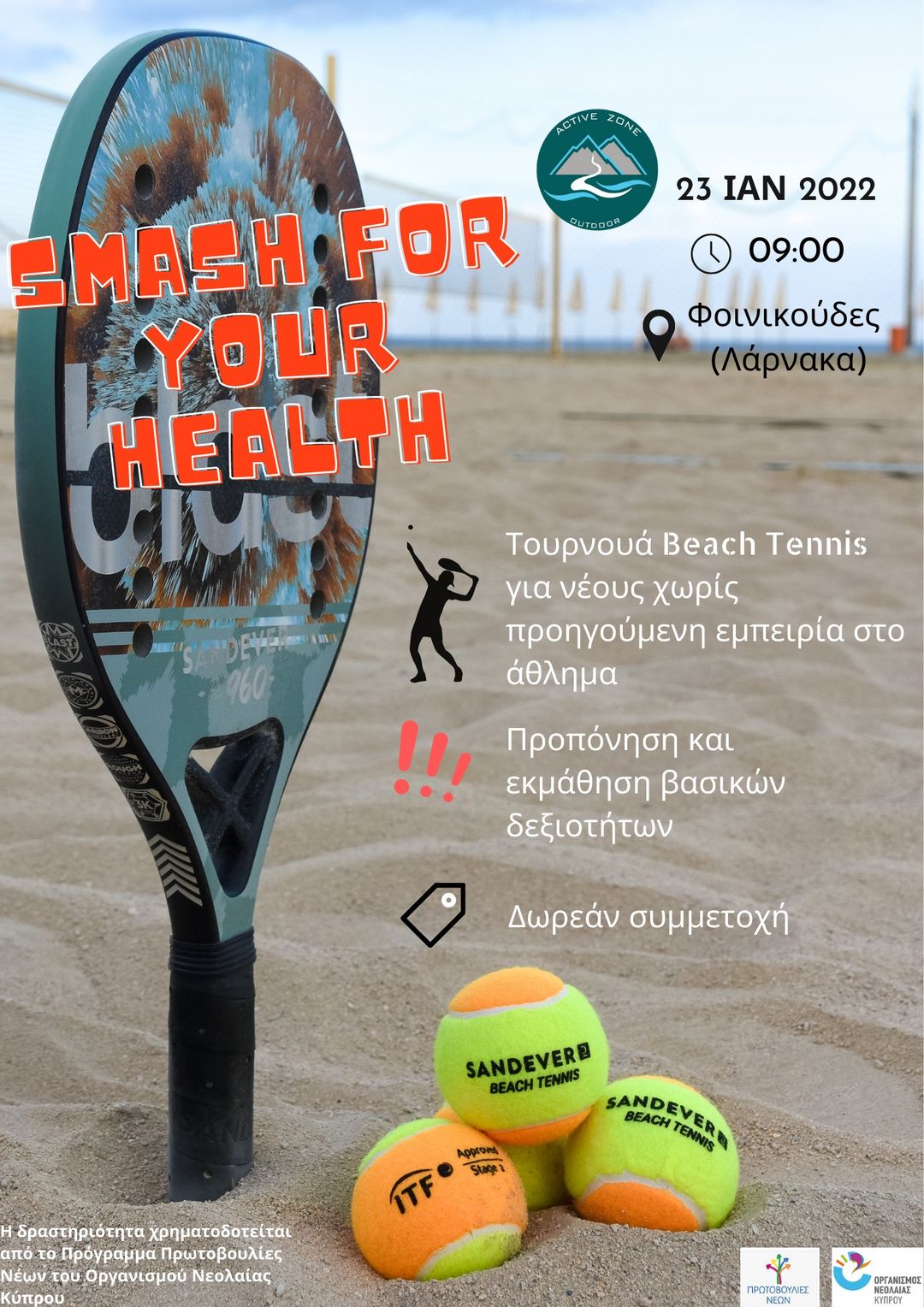 Ο Active Zone Outdoor διοργανώνει αθλητική ημερίδα γνωριμίας των νέων με το άθλημα του Beach Tennis. Η δραστηριότητα αποτελείται από δύο κυρίως μέρη: Στο πρώτο μέρος, οι νέοι θα συμμετάσχουν σε ένα ταχύρρυθμο πρόγραμμα προπόνησης με σκοπό να αποκτήσουν πρακτικές δεξιότητες στο άθλημα ενώ, στο δεύτερο μέρος θα πραγματοποιηθεί τουρνουά με την κοινή συμμετοχή των νέων και αθλητών/αθλητριών beach tennis.