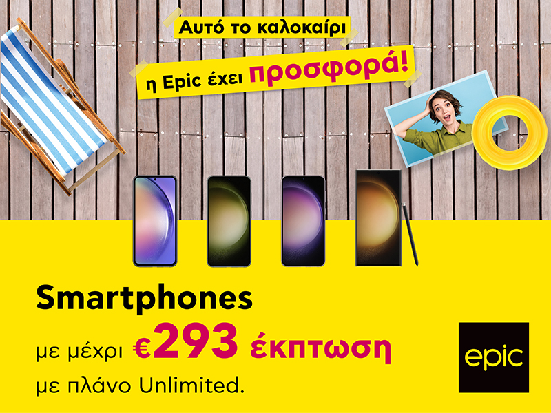 Κάθε καλοκαίρι μαζεύουμε τις πιο έντονες στιγμές και φτιάχνουμε το πιο όμορφο & πολύχρωμο παζλ από ιστορίες. Φέτος, η Epic σου δίνει την ευκαιρία να φτιάξεις το δικό σου και να το μοιραστείς με νέο smartphone και 5G ταχύτητες. Γιατί τώρα, προσφέρουμε τα πιο hot smartphones με €0 ευρώ αρχικά και έκπτωση μέχρι €293, μαζί με πλάνο Unlimited για να απολαμβάνεις την επικοινωνία σου απεριόριστα, στις maximum ταχύτητες και χωρίς συμβιβασμούς.