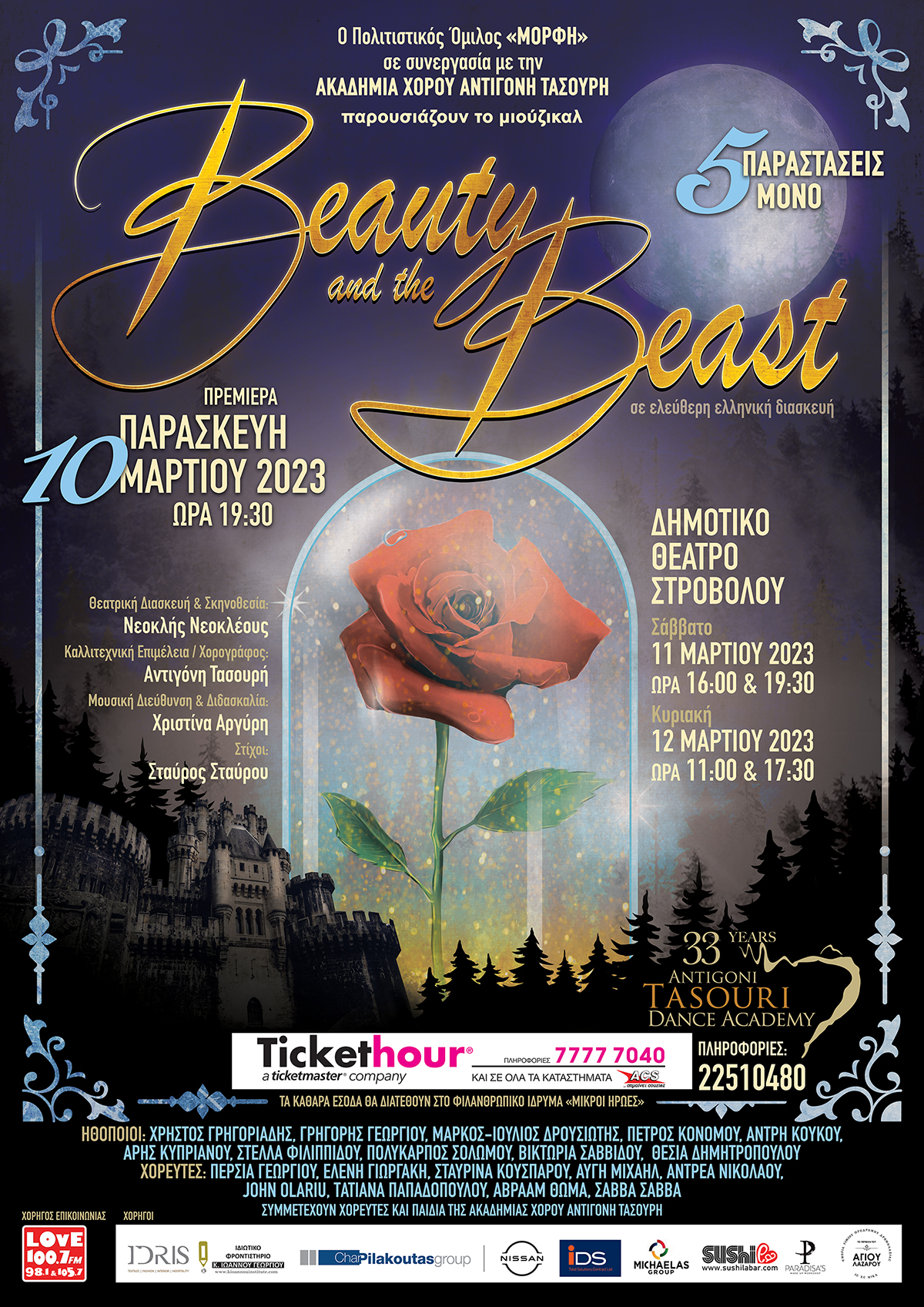Η Ακαδημία Χορού Αντιγόνη Τασουρή σε συνεργασία με τον Πολιτιστικό Όμιλο «ΜΟΡΦΗ», παρουσιάζει στις 10, 11 και 12 Μαρτίου 2023 στο Δημοτικό Θέατρο Στροβόλου το μιούζικαλ «Βeauty and the Beast» για 5 μόνο παραστάσεις.