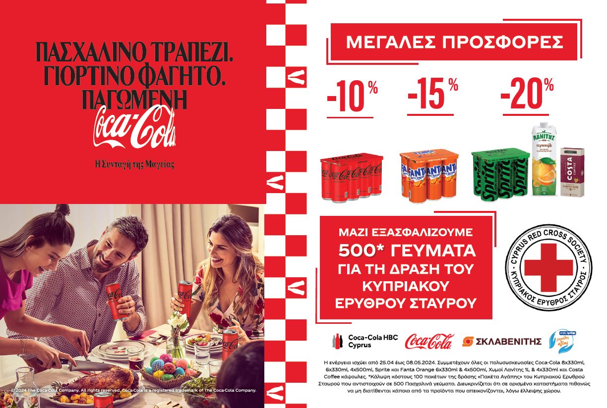 Κάνοντας πράξη το κεντρικό μήνυμα της καμπάνιας της Coca-Cola «Η Συνταγή της Μαγείας» με στόχο να φέρει το γιορτινό φαγητό στο Πασχαλινό τραπέζι με παγωμένη Coca-Cola σε κάθε σπίτι, η Coca-Cola HBC Κύπρου ενώνει τις δυνάμεις της με τα καταστήματα Σκλαβενίτη για καλό σκοπό. Μέσα από αυτή τη συνέργεια που αφορά σε επιλεγμένα προϊόντα από το χαρτοφυλάκιο της Coca-Cola HBC Κύπρου, καλύπτει το κόστος για 100 πακέτα αγάπης, τα οποία ισοδυναμούν με 500 Πασχαλινά γεύματα, τα οποία θα διοχετευτούν σε ευάλωτες οικογένειες που το έχουν ανάγκη μέσω της δράσης «Πακέτα Αγάπης» του Κυπριακού Ερυθρού Σταυρού.