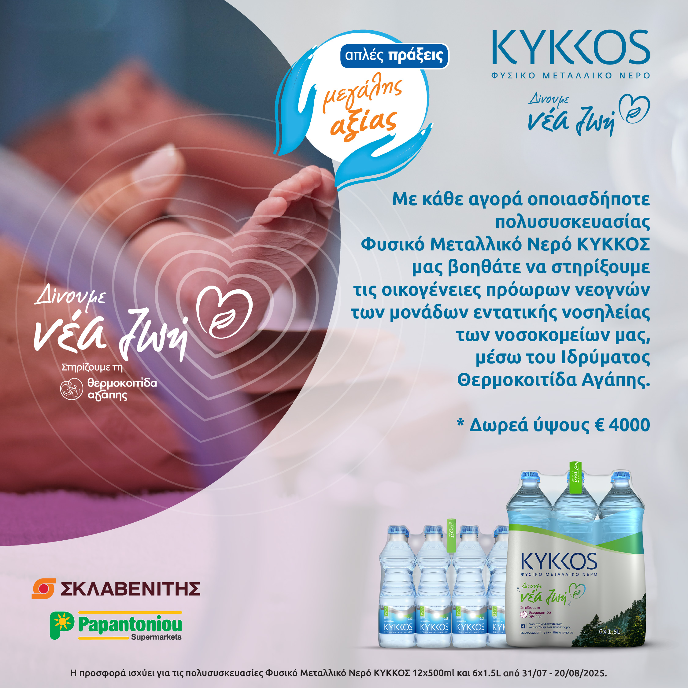 Κάνοντας πράξη το κεντρικό μήνυμα της καμπάνιας του Φυσικού Μεταλλικού Νερού ΚΥΚΚΟΣ «Δίνουμε νέα ζωή», η Coca-Cola HBC Κύπρου ενώνει τις δυνάμεις της με τις υπεραγορές ΣΚΛΑΒΕΝΙΤΗΣ και Παπαντωνίου, για καλό σκοπό. Μέσα από αυτή τη συνέργεια που αφορά στις πολυσυσκευασίες του Φυσικού Μεταλλικού Νερού ΚΥΚΚΟΣ στηρίζει τις οικογένειες των πρόωρων νεογνών των μονάδων εντατικής νοσηλείας των νοσοκομείων μας, μέσω του ιδρύματος «Θερμοκοιτίδα Αγάπης» με δωρεά ύψους 4.000 ευρώ.