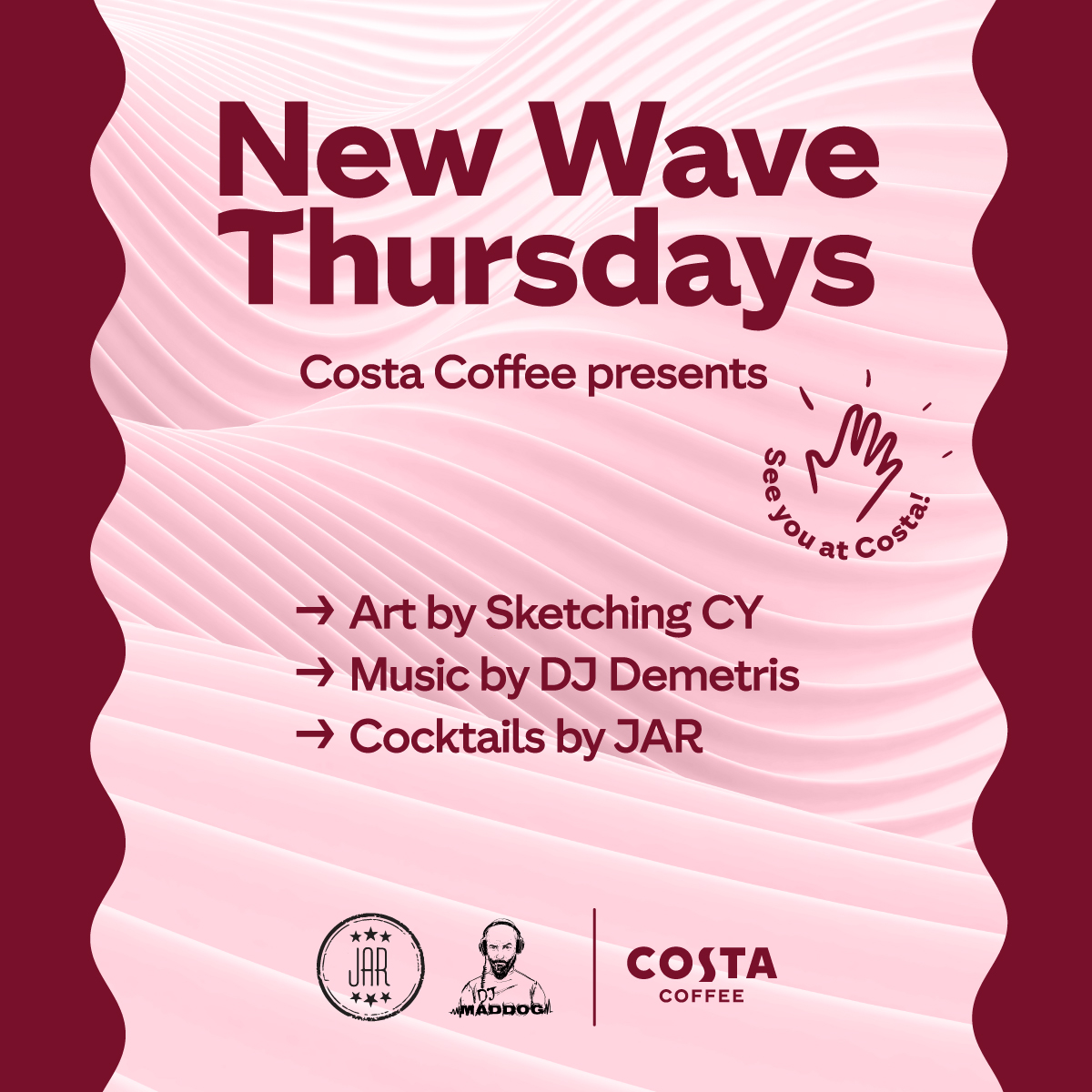 Κάθε Πέμπτη, από τις 20 Ιουλίου μέχρι τις 10 Αυγούστου, ξεκινώντας από τις 18:00, τέχνη, cocktails και μουσική έρχονται να δώσουν μια νέα πνοή στο ζεστό καλοκαίρι του Costa Coffee. Μπαίνοντας σε πιο χαλαρωτική διάθεση και ρυθμό, προσκαλεί τον κόσμο σε ένα απόγευμα που τα έχει όλα: Απολαυστικά cocktails by JAR, με τη συνοδεία της μουσικής του DJ Demetris, απολαμβάνοντας την ίδια ώρα το έργο των νέων καλλιτεχνών.