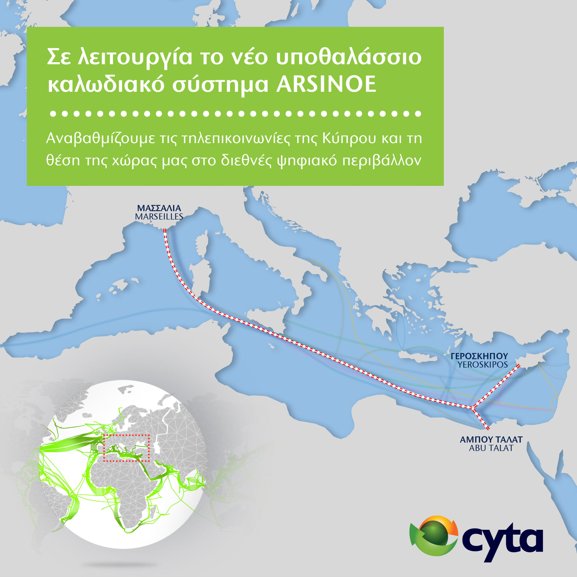 Η Cyta ανακοινώνει την έναρξη λειτουργίας του υποθαλάσσιου καλωδιακού συστήματος οπτικών ινών, ARSINOE, που έρχεται να καλύψει τις αυξανόμενες ανάγκες της χώρας για διεθνή συνδεσιμότητα σε κομβικούς τομείς, ιδιαίτερα σε υπηρεσίες Διαδικτύου και Νέφους (cloud). Ενισχύει την ασφάλεια εναλλακτικών δρομολογήσεων στις ψηφιακές επικοινωνίες μεταξύ της Κύπρου και του υπόλοιπου κόσμου, και ανταποκρίνεται στις ανάγκες υπηρεσιών που απαιτούν χαμηλή καθυστέρηση μεταφοράς δεδομένων.