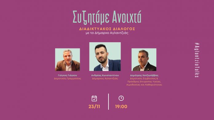 Ανταποκρινόμενος στις απαιτήσεις της σύγχρονης εποχής και με γνώμονα πάντα το όφελος του δημότη, ο Δήμος Αγλαντζιάς εγκαινιάζει μια σειρά διαδικτυακών εκδηλώσεων, με τίτλο «Συζητάμε Ανοιχτά» (Facebook Event: https://fb.me/e/3CyQOwG6Q).
