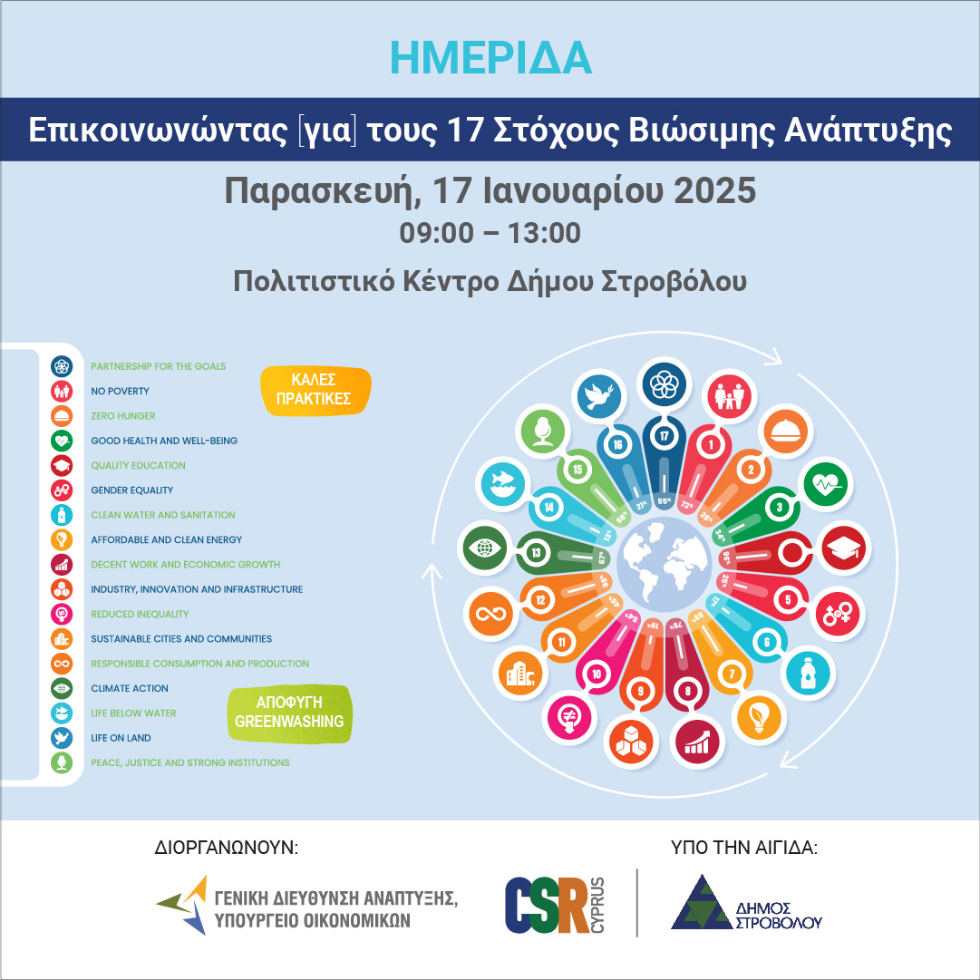 Το CSR Cyprus και η Γενική Διεύθυνση Ανάπτυξης (Υπουργείο Οικονομικών) συνδιοργανώνουν ημερίδα με θέμα «Επικοινωνώντας [για] τους 17 Στόχους Βιώσιμης Ανάπτυξης» την Παρασκευή, 17 Ιανουαρίου 2025 στο Πολιτιστικό Κέντρο του Δήμου Στροβόλου (Αρχιεπισκόπου Κυπριανού 34, 2059 Στρόβολος), μεταξύ 09:00-13:00. Η ημερίδα τελεί υπό την αιγίδα του Δήμου Στροβόλου.