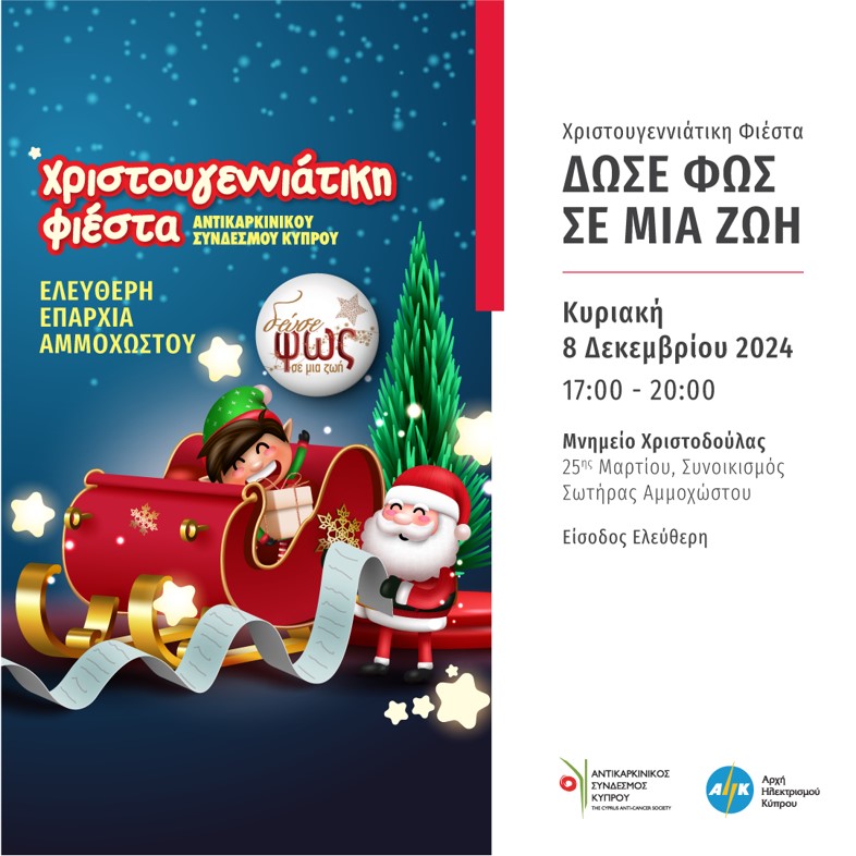 - Λευκωσία: Χριστουγεννιάτικη Φιέστα το Σάββατο 7 Δεκεμβρίου 2024, από τις 10:00 μέχρι τις 18:30 στα Κεντρικά Γραφεία της ΑΗΚ (Αμφιπόλεως 11, Στρόβολος).