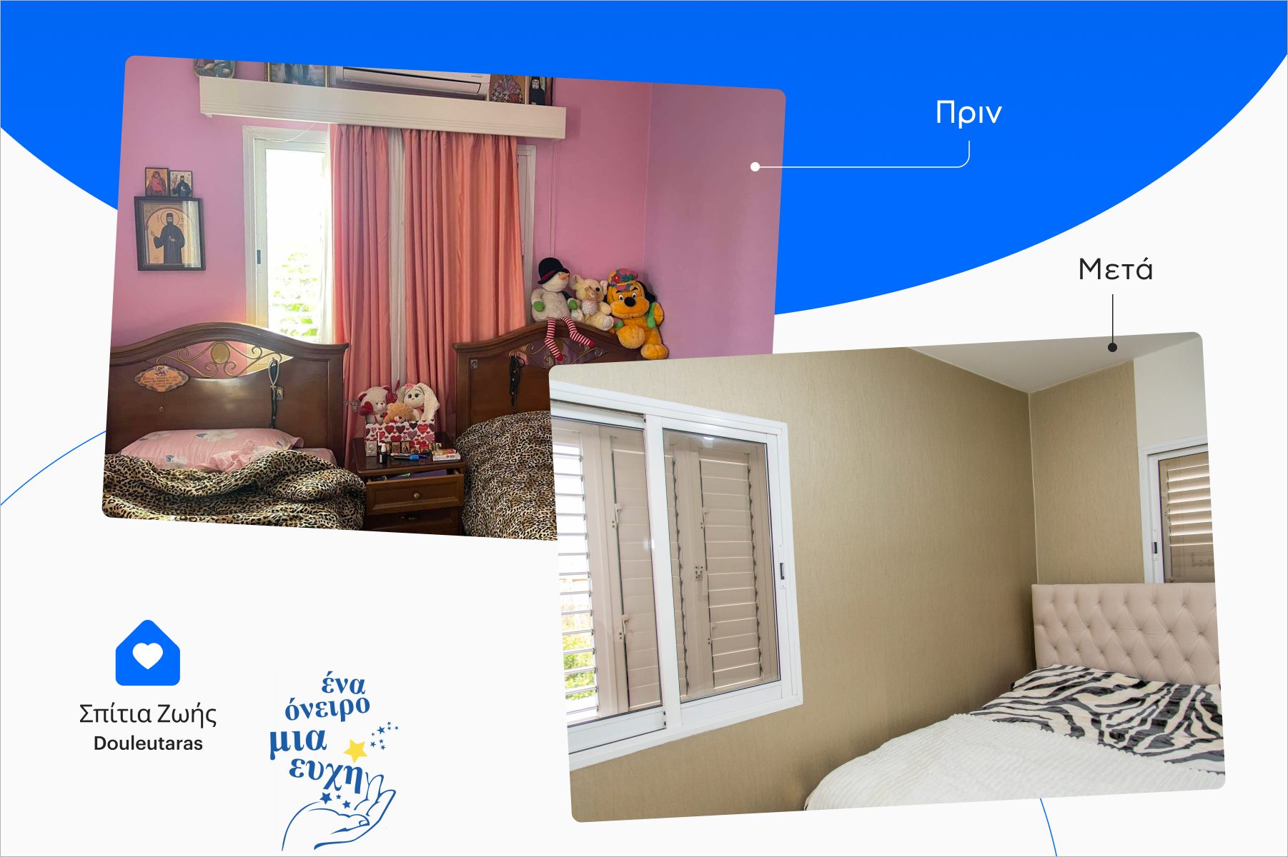Σε μια μεγάλη και συνάμα συγκινητική πράξη ανθρωπιάς προχώρησε ο Douleutaras, η παγκύπρια Νο1 Πλατφόρμα Εύρεσης Επαγγελματιών, στο πλαίσιο του προγράμματος ΕΚΕ «Σπίτια Ζωής». Ανέλαβε μαζί με τον Παγκύπριο Σύνδεσμο για παιδιά με καρκίνο και συναφείς παθήσεις «Ένα Όνειρο Μια Ευχή» να εκπληρώσει την ευχή μιας νεαρής καρκινοπαθούς που ζει στην επαρχία της Λεμεσού, προχωρώντας σε πλήρη ανακαίνιση του υπνοδωματίου της.