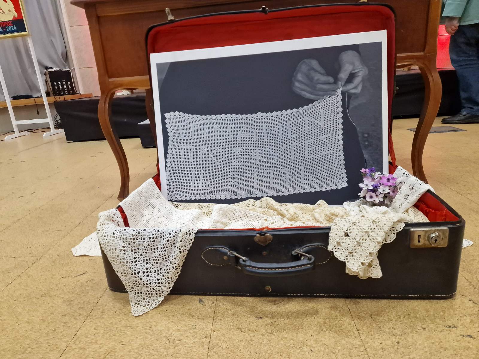 Η μικρή έκθεση στη σκηνή «Βαλίτσες του 1974» είναι έργο της εικαστικού Πόπης Νικολάου για το οποίο χρησιμοποιήθηκαν προσφυγικά αντικέιμενα και συγκλονιστικές φωτογραφίες του φωτογραφικού αρχείου «Δια Χειρός Αττίλα» της φωτορεπόρτερ Κάτιας Χριστοδούλου.