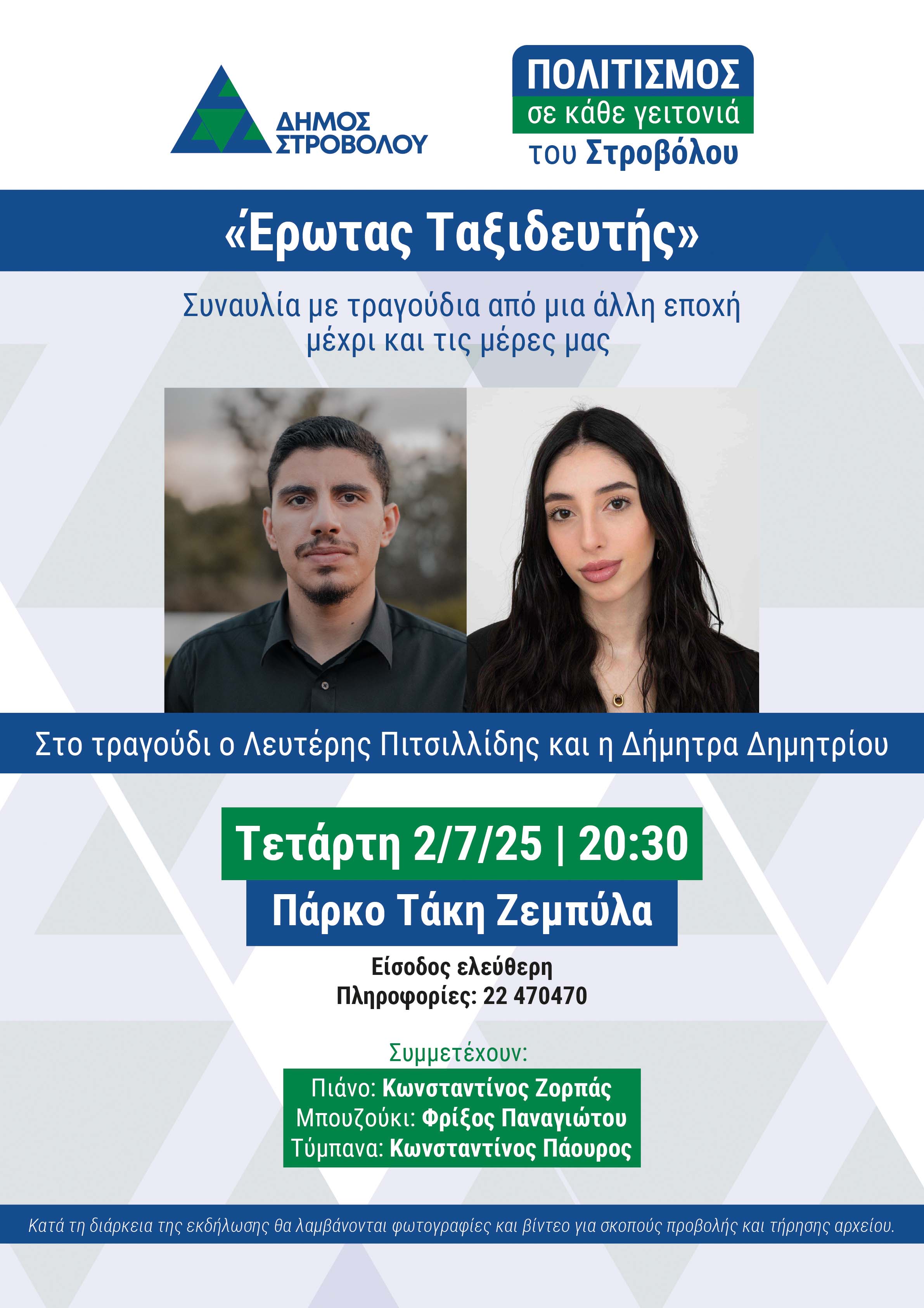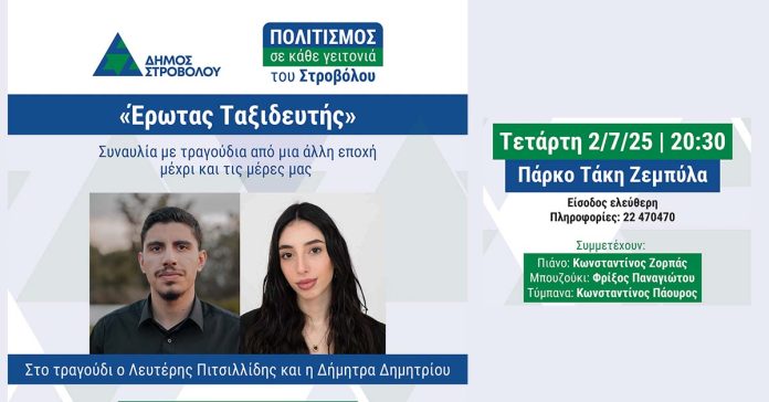 Έναρξη νέου θεσμού «Πολιτισμός σε κάθε Γειτονιά του Στροβόλου» με τη συναυλία «Έρωτας Ταξιδευτής» την Τετάρτη 2 Ιουλίου στο Πάρκο Τάκη Ζεμπύλα
