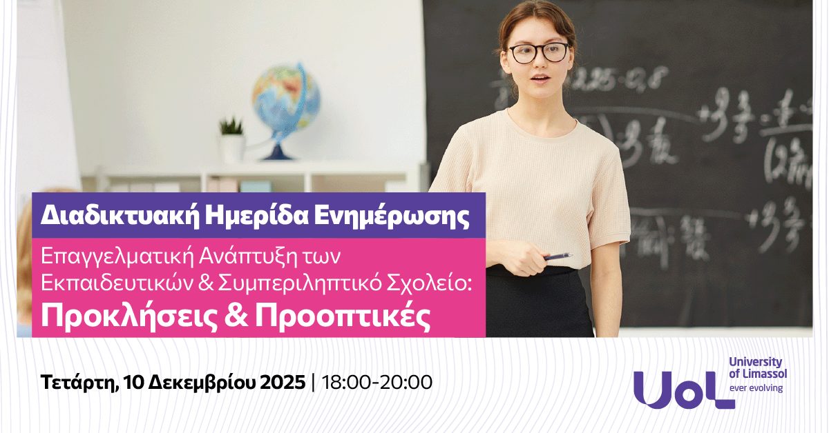 Με μεγάλη επιτυχία πραγματοποιήθηκε η διαδικτυακή Ημερίδα με τίτλο «Επαγγελματική Ανάπτυξη των Εκπαιδευτικών και Συμπεριληπτικό Σχολείο: Προκλήσεις και Προοπτικές», την οποία διοργάνωσε το Τμήμα Επιστημών της Αγωγής της Σχολής Κοινωνικών και Ανθρωπιστικών Επιστημών του Πανεπιστημίου Λεμεσού.