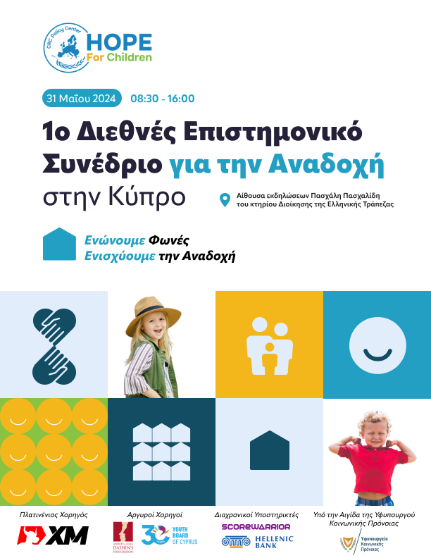 Το “Hope For Children” CRC Policy Center, με αφορμή την Παγκόσμια Ημέρα Αναδοχής, διοργανώνει το «1ο Διεθνές Επιστημονικό Συνέδριο για την Αναδοχή στην Κύπρο», υπό την αιγίδα της Υφυπουργού Κοινωνικής Πρόνοιας, κας. Μαριλένας Ευαγγέλου. Το Συνέδριο θα πραγματοποιηθεί την Παρασκευή, 31 Μαΐου 2024, μεταξύ των ωρών 08:30-16:00, στην αίθουσα εκδηλώσεων Πασχάλη Πασχαλίδη, του κτηρίου Διοίκησης της Ελληνικής Τράπεζας στη Λευκωσία. Με σλόγκαν «Ενώνουμε Φωνές, Ενισχύουμε την Αναδοχή», το Συνέδριο, θα αποτελέσει μια καινοτόμα πλατφόρμα συλλογής και ανταλλαγής απόψεων, φέρνοντας μαζί κυβερνητικούς λειτουργούς, ακαδημαϊκούς και εμπειρογνώμονες του κλάδου από την Κύπρο και το εξωτερικό, ανάδοχους γονείς, πρώην ανάδοχα παιδιά καθώς και το ευρύ κοινό, σε μια συλλογική προσπάθεια για ενίσχυση της ευαισθητοποίησης και συζήτησης βέλτιστων πρακτικών σε σχέση με τον θεσμό της αναδοχής.