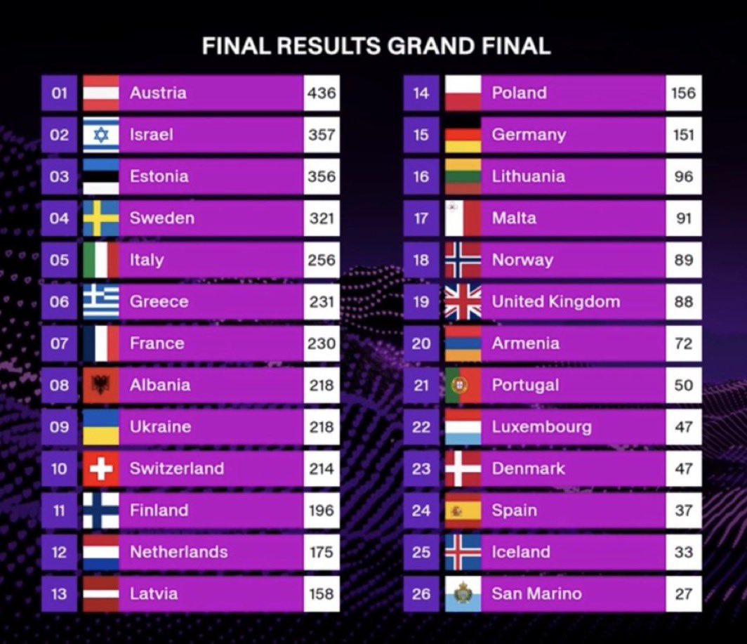 Η εξαιρετική εμφάνιση του εκπροσώπου της Αυστρίας, JJ, με το τραγούδι «Wasted Love» κατάφερε να κερδίσει τις καρδιές των επιτροπών και του κοινού, αποσπώντας την πολυπόθητη πρώτη θέση μετά από χρόνια. Η Αυστρία έλαμψε στη σκηνή με μια εκρηκτική και ταυτόχρονα συναισθηματική παρουσίαση, που συνδύαζε την πρωτοποριακή σκηνική αισθητική με ένα καλοδουλεμένο τραγούδι που μίλησε στην καρδιά των θεατών. Η νίκη της σηματοδοτεί ένα νέο κεφάλαιο για τη χώρα, που ανέκαθεν συμμετείχε δυναμικά στον διαγωνισμό.