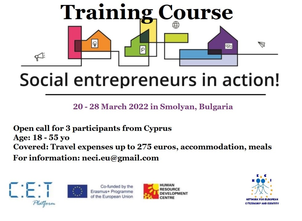 NECI EU ανακοινώνει ότι υπάρχει πρόσκληση για 3 συμμετέχοντες από την Κύπρο για το εκπαιδευτικό σεμινάριο στη Βουλγαρία για την Κοινωνική Επιχειρηματικότητα.