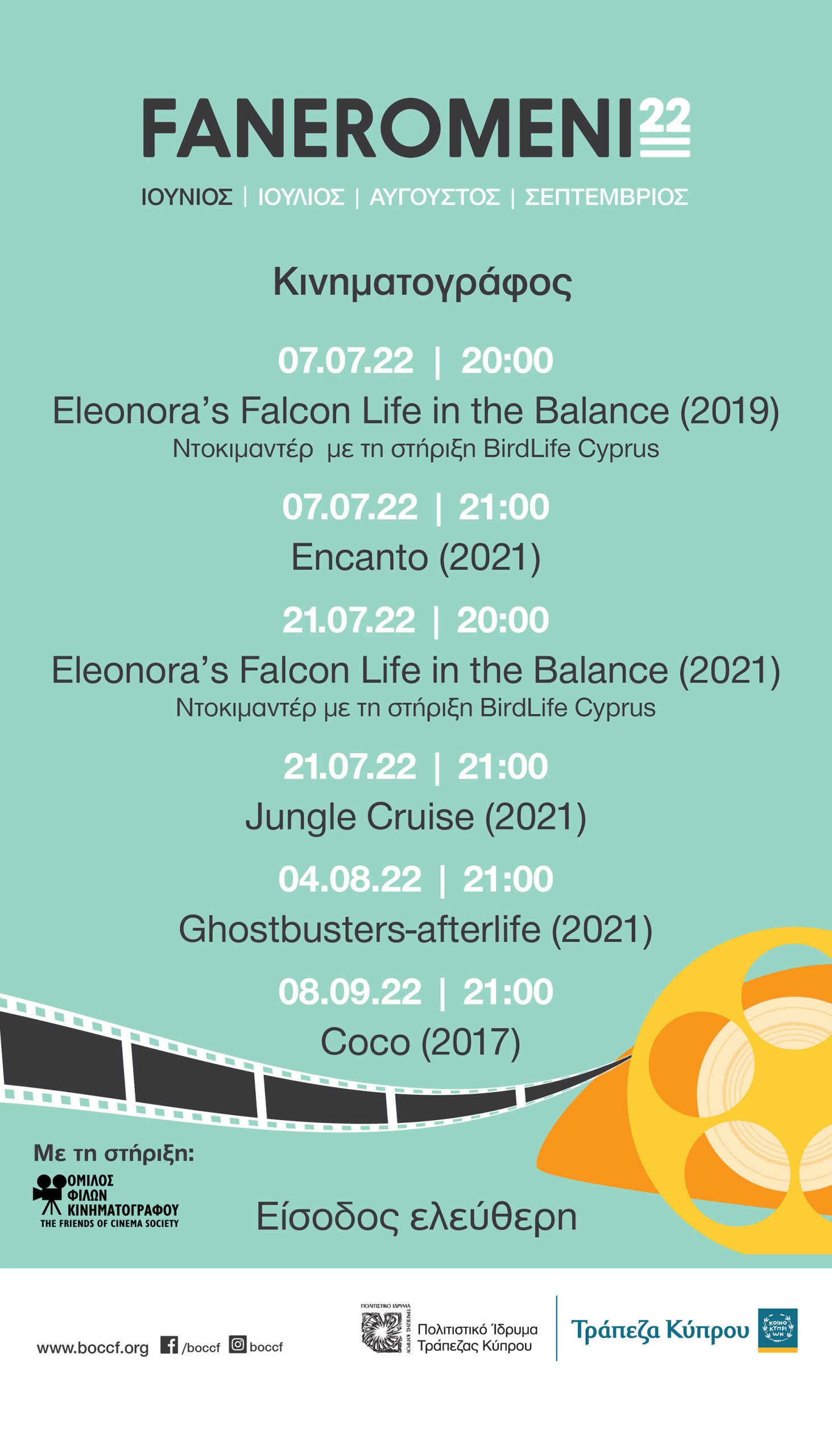 Κάτω από τον τίτλο του Φεστιβάλ «Πολιτισμός ξανά», η αυλή του Πολιτιστικού μετατρέπεται σε ένα υπαίθριο καλοκαιρινό κινηματογράφο με την προβολή 4 ταινιών και ένος ντοκυμαντέρ φύσης με την τη στήριξη του BirdLife Cyprus και BirdLife Ηνωμένου Βασιλείου)