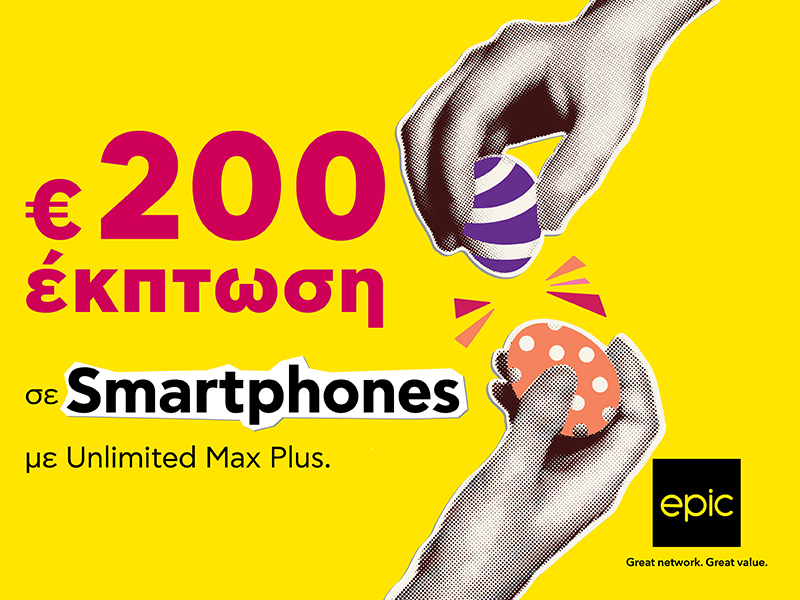 Το Πάσχα πλησιάζει και η Epic σου δίνει την ευκαιρία αποκτήσεις νέο smartphone με την πιο επική προσφορά της αγοράς. Προσφέρουμε τα πιο hot smartphones με €0 αρχικά και €200 έκπτωση μαζί με πλάνο 5G Unlimited Max Plus, όλα με ένα εκπληκτικά χαμηλό μηνιαίο πάγιο!
