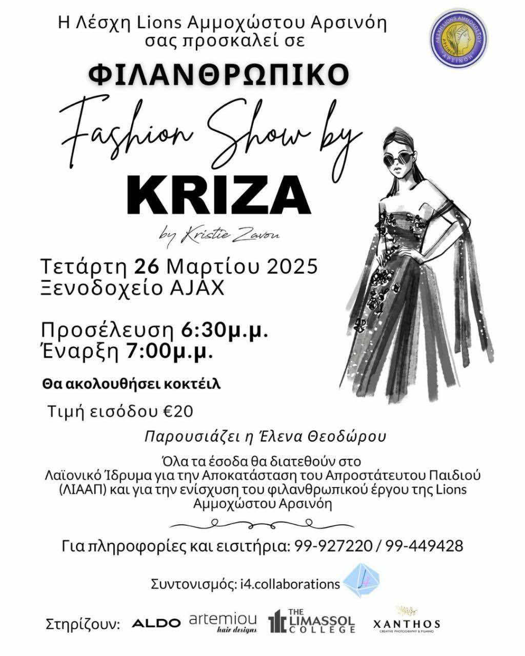 H Λέσχη Lions Αμμοχώστου Αρσινόη, διοργανώνει την Τετάρτη 26 Μαρτίου 2025 στο Ξενοδοχείο AJAX στη Λεμεσό την φιλανθρωπική επίδειξη μόδας με τη συμμετοχή της Κύπριας σχεδιάστριας Κρίστης Ζαβού, η οποία θα παρουσιάσει τη νέα της συλλογή Άνοιξη/Καλοκαίρι 2025 με μοναδικές δημιουργίες, συνδυάζοντας την κομψότητα και την υψηλή ραπτική.