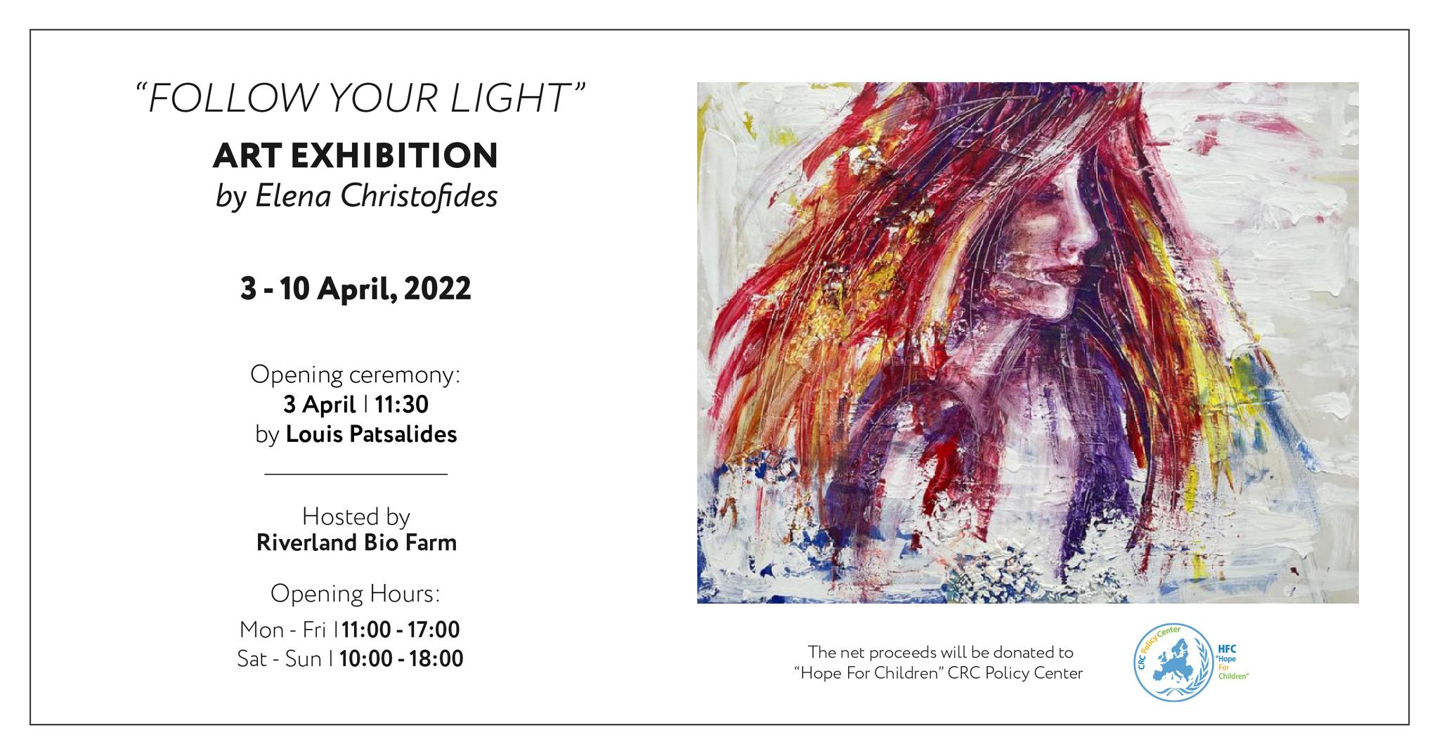 Η γνωστή εικαστικός Έλενα Χριστοφίδου, θέλοντας να συνεισφέρει εμπράκτως στο ανθρωπιστικό έργο του “Hope For Children” CRC Policy Center, οργανώνει από τις 3 μέχρι και τις 10 Απριλίου 2022 την έκθεση ζωγραφικής “Follow your Light”, η οποία θα φιλοξενείται στη φάρμα Riverland Bio Farm