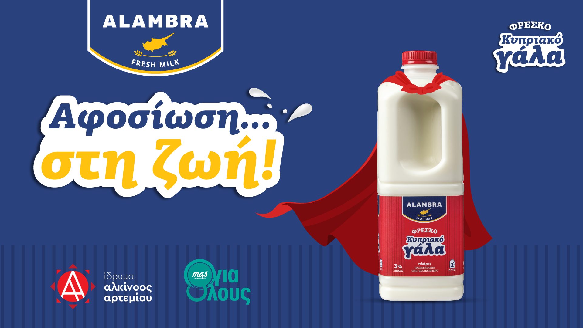 Συγκεκριμένα, με την αγορά οποιασδήποτε συσκευασίας Φρέσκου Κυπριακού Γάλακτος ΑΛΑΜΠΡΑ (1L, 1.5L ή 2L) από τα ψυγεία των Υπεραγορών MAS, θα προσφέρονται στο ίδρυμα Αλκίνοος Αρτεμίου 3 σεντς ανά λίτρο.