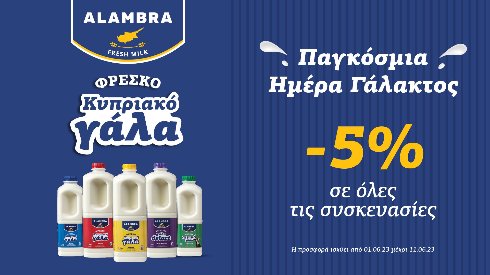 Θέλοντας να τιμήσει τη συγκεκριμένη ημέρα, η Γαλακτοβιομηχανία Αλάμπρα θα προσφέρει όλες τις συσκευασίες του Φρέσκου Κυπριακού Γάλακτος ΑΛΑΜΠΡΑ με 5% έκπτωση, από την 1η μέχρι την 11η Ιουνίου.