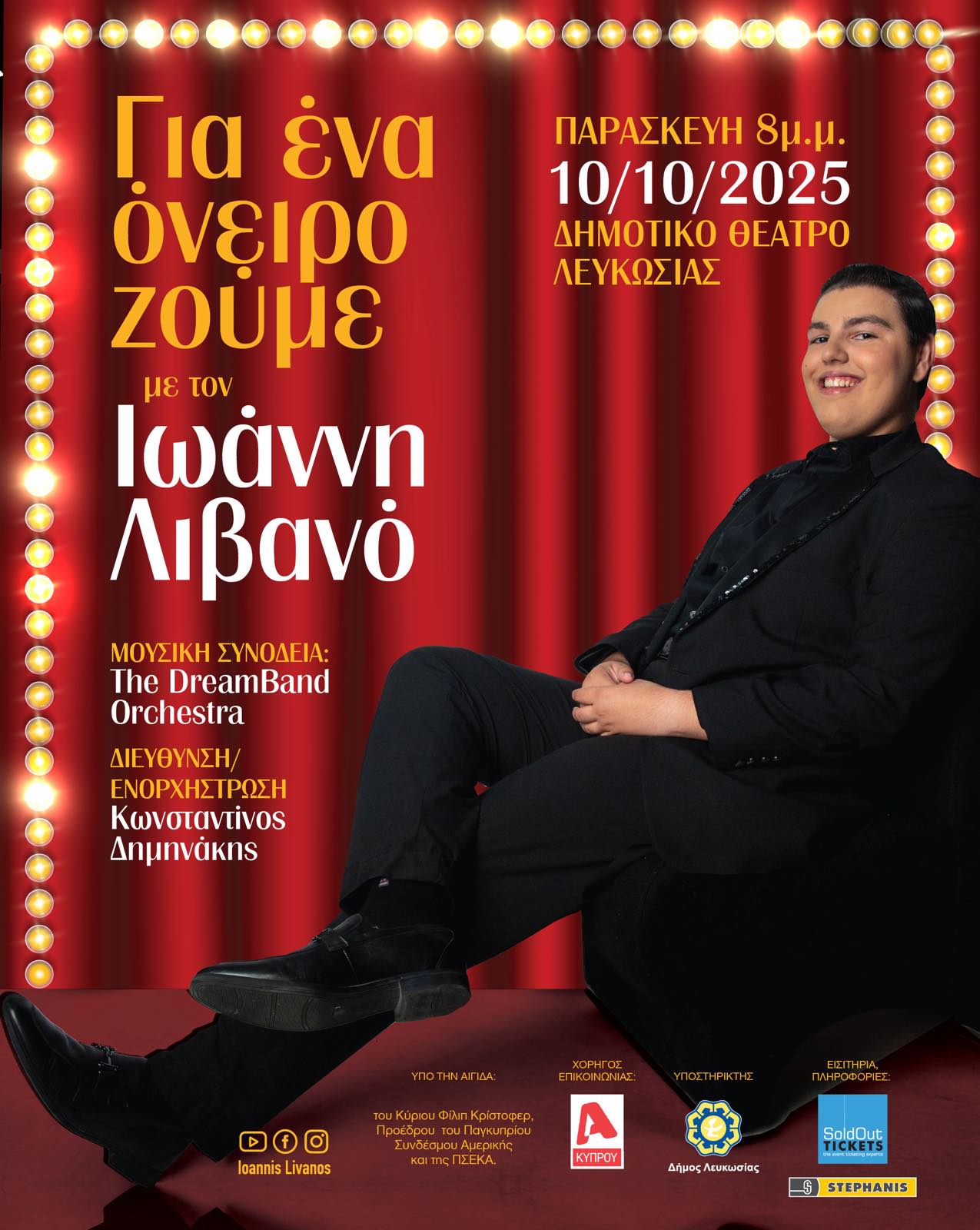 Ο Ιωάννης Λιβανός, ο πολυτάλαντος και πολυβραβευμένος 17χρονος τενόρος θα σας μαγέψει με την πιο φιλόδοξη και θεαματική του συναυλία μέχρι σήμερα:με τίτλο «Για Ένα Όνειρο Ζούμε». Θάναι μια βραδιά που δεν θα μοιάζει με καμία άλλη αφού θα ερμηνεύσει αγαπημένα τραγούδια σε επτά γλώσσες από τα καλύτερα Musicals του Broadway, του Κινηματογράφου, της Όπερας, της jazz, και τον χώρο της ελληνικής δισκογραφίας.