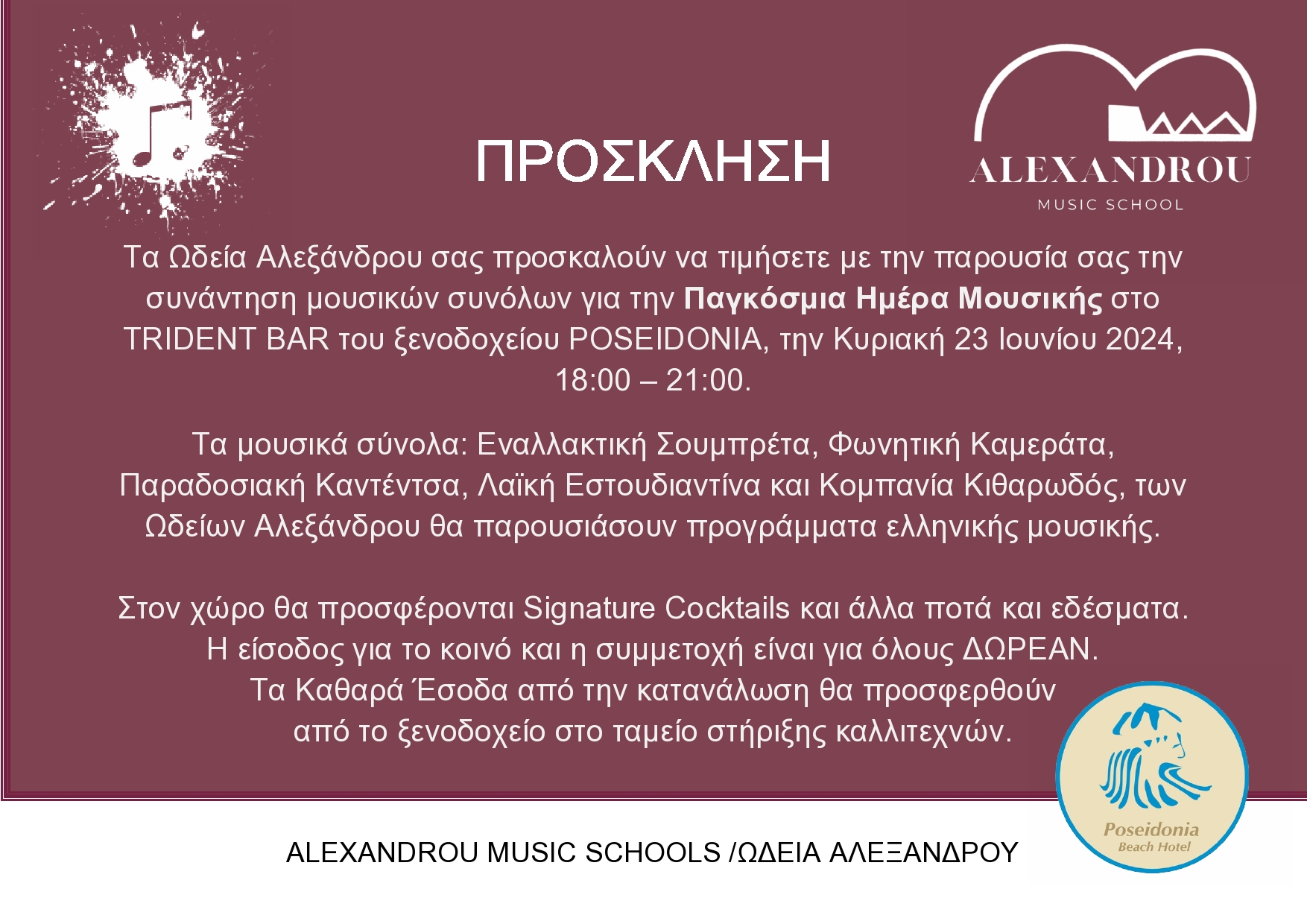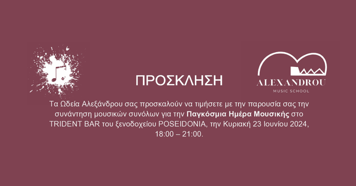 Τα ΩΔΕΙΑ ΑΛΕΞΑΝΔΡΟΥ και το POSEIDONIA HOTEL τιμούν την ΗΜΕΡΑ ΜΟΥΣΙΚΗΣ και σας προσκαλούν σε μια μουσική συνάντηση – περφόρμανς μουσικών συνόλων, στο TRIDENT BAR του ξενοδοχείου την Κυριακή, 23 Ιουνίου 2024.