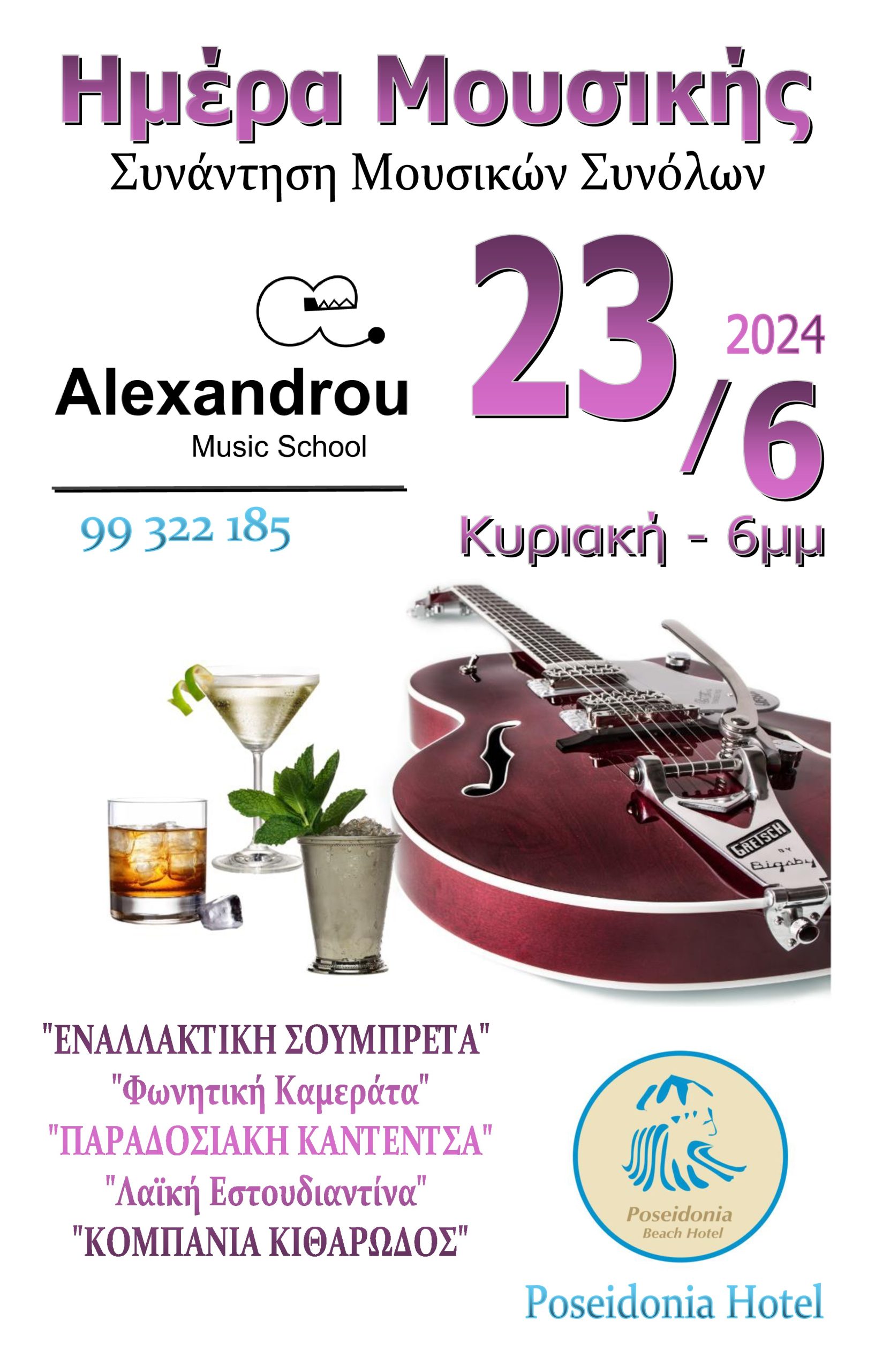 Για την Παγκόσμια Ημέρα Μουσικής τα Ωδεία Αλεξάνδρου διοργανώνουν συνάντηση μουσικών συνόλων στο Ξενοδοχείο Ποσειδώνια στην Λεμεσό, την Κυριακή 23 Ιουνίου 2024, 18:00 – 21:00.