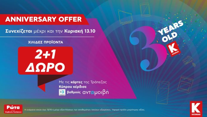 Με δυνατές προσφορές μέχρι και την Κυριακή 13 Οκτωβρίου, συνεχίζει να γιορτάζει η Κωτσόβολος τα 3 χρόνια παρουσίας της στην Κύπρο.