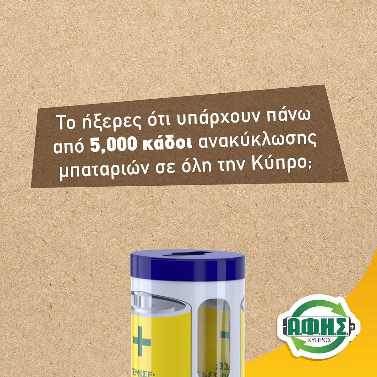 Κάθε φορά, λοιπόν, που αδειάζουν οι μπαταρίες, δεν πάνε στα σκουπίδια, αλλά στους ειδικούς κάδους ανακύκλωσης της Α.Φ.Η.Σ. Κύπρου, τους οποίους μπορείς να βρεις σε πάνω από 5.000 σημεία σε όλη την Κύπρο… σε υπεραγορές, εμπορικά κέντρα, εμπορικά καταστήματα, τράπεζες, σχολεία, ταχυδρομεία, καταστήματα τηλεπικοινωνιών και ηλεκτρικών ειδών, γραφεία, δημόσια κτήρια και γενικότερα σε υπηρεσίες και καταστήματα με μεγάλη επισκεψιμότητα.