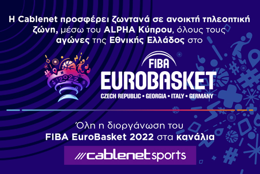 Η Cablenet αποκλειστικός Τηλεοπτικός Χορηγός του EuroBasket 2022 θέλοντας να δώσει τη δυνατότητα σε όλο το φίλαθλο κοινό της Κύπρου να παρακολουθήσει την προσπάθεια της Εθνικής Ελλάδος στο FIBA EuroBasket 2022, ήρθε σε συμφωνία με τον ALPHA Κύπρου για να προβάλει ζωντανά σε ανοικτή τηλεοπτική ζώνη, όλους τους αγώνες της Εθνικής Ελλάδος, μέσω του καναλιού ALPHA Κύπρου.