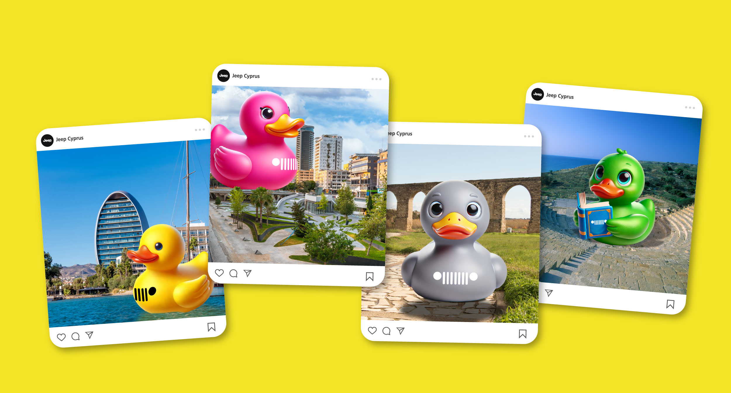 Για τις ανάγκες της καμπάνιας η Jeep® Cyprus προχώρησε με την υλοποίηση μιας σειράς επικοινωνιακών δράσεων, ενώ με τη χρήση της τεχνολογίας «τοποθέτησε» γιγαντιαίες πάπιες σε διάφορα, χαρακτηριστικά σημεία της Κύπρου, τονίζοντας ότι τα Jeep® Ducks κατέκτησαν και το νησί μας.