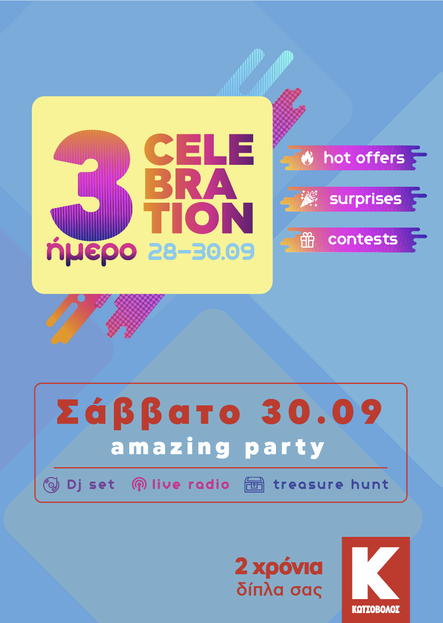 Με την ευκαιρία της συμπλήρωσης του 2ου χρόνου λειτουργίας των καταστημάτων της, σε Λευκωσία, Λεμεσό και Πάφο, η Κωτσόβολος, μας προσκαλεί σε ένα γιορταστικό τριήμερο από τις 28 έως τις 30 Σεπτεμβρίου, με κορυφαίες προσφορές (30% όφελος σε χιλιάδες οικιακές συσκευές και προϊόντα τεχνολογίας και πενταπλάσιους βαθμούς ανταμοιβή για αγορές με κάρτες της τράπεζας Κύπρου), εκπλήξεις και διαγωνισμούς κάθε μέρα, σε κάθε κατάστημα.