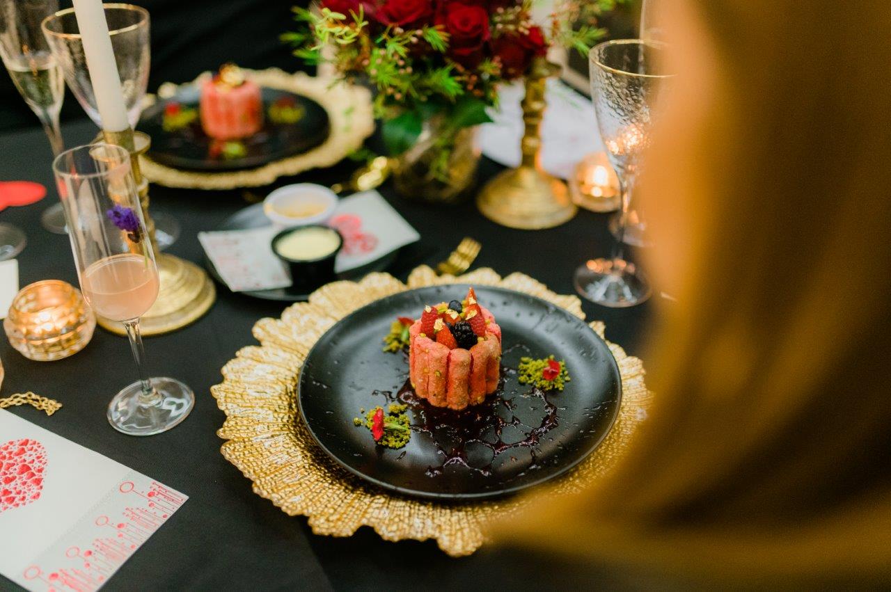 Η βραδιά ξεκίνησε με ένα διαφορετικό ποτό, ζεσταίνοντας την ατμόσφαιρα με ένα ροζέ Προσέκο με σιρόπι τσιχλόφουσκας και συνεχίστηκε με ένα amuche-buche από αυγά λευκού οξύρρυγχου και κρέμα σαμπάνιας. Το κυρίως πιάτο ήταν ένα μαγευτικό βοδινό φιλέτο, συνοδευόμενο από ριζότο με βασιλομανίταρα, βούτυρο τρούφας και τραγανή γκοφρέτα παρμεζάνας. Εκτός από το επιδόρπιο της κόκκινης σαρλότας με τα φύλλα χρυσού και το μους των φρούτων του δάσους, οι παρευρισκόμενοι απόλαυσαν και ένα άκρως ρομαντικό petit four, μακαρόν με γκανάζ τριαντάφυλλου με ζαχαρωμένα ροδοπέταλα, μια νοστιμιά που σίγουρα δεν συναντά κανείς κάθε μέρα.