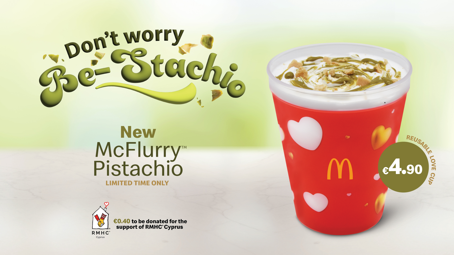 ‘Don’t Worry, Be-Stacchio! Η McDonald’s ευχαριστεί τους μικρούς και μεγάλους fans των εστιατορίων της, αλλά και όλο τον κόσμο που αγκάλιασε την πρόσφατη εκστρατεία της με το νέο McFlurry Pistachio. Το αγαπημένο McFlurry κυκλοφόρησε σε limited edition με pistachio sauce και τραγανή γκοφρέτα, και αποτέλεσε την πιο γλυκιά αφορμή για προσφορά προς το Ronald McDonald House Charities Κύπρου.