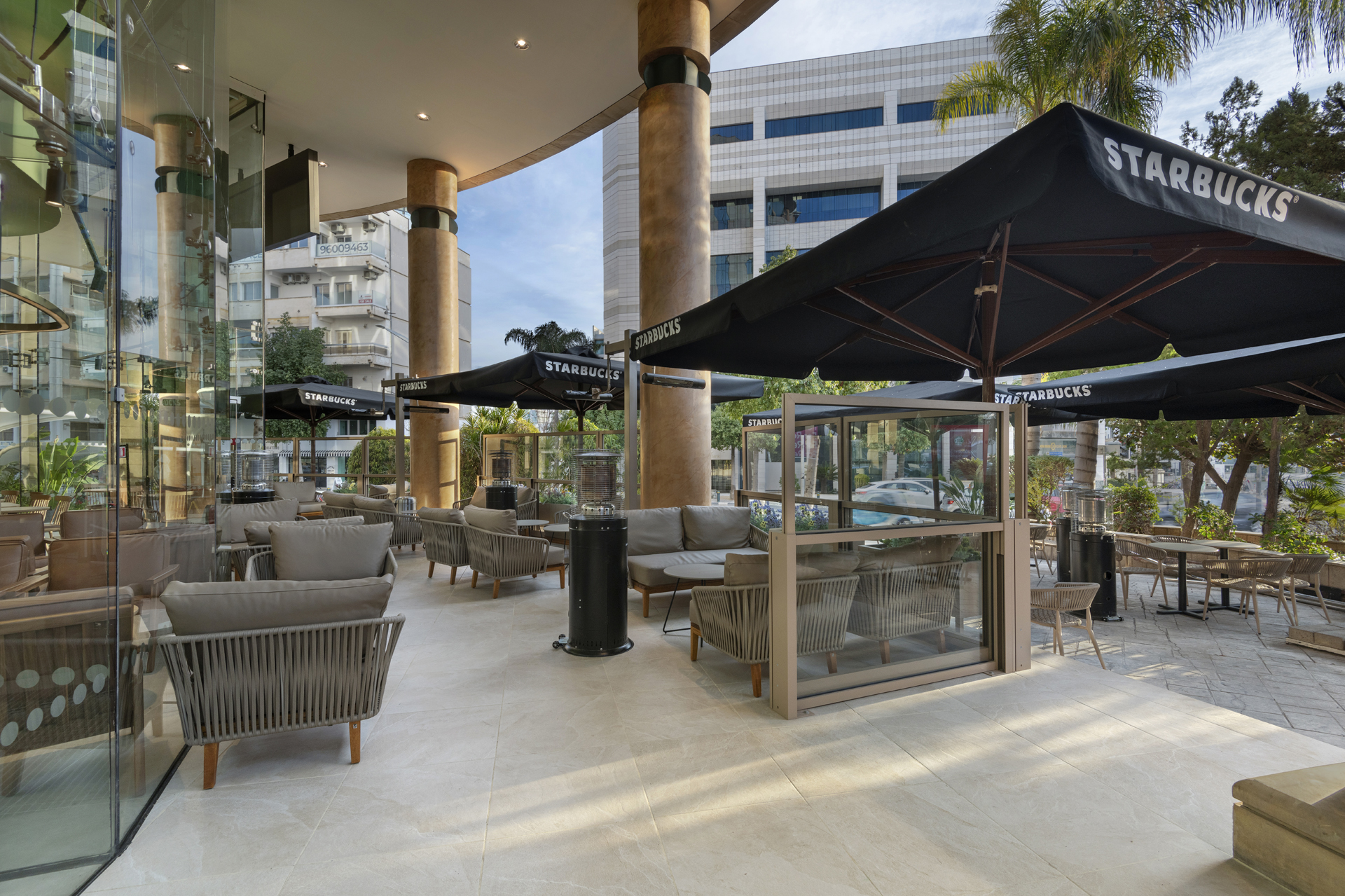 Ο εξωτερικός χώρος, περιμετρικά καλυμμένος από ανεμοφράκτες υψηλής αισθητικής, προσφέρει ένα ζεστό και φιλόξενο περιβάλλον. Τα έπιπλα εξωτερικού χώρου, σε μοντέρνα χρώματα και σχέδια που εκφράζουν απόλυτα την ταυτότητα των Starbucks, συνδυάζουν στιλ και άνεση, σ’ ένα περιβάλλον ιδανικά διαμορφωμένο για κάθε εποχή, με ηλεκτρικές σόμπες να το διατηρούν ζεστό τον χειμώνα και ανεμιστήρες να εξασφαλίζουν το καλοκαίρι την απαραίτητη δροσιά.