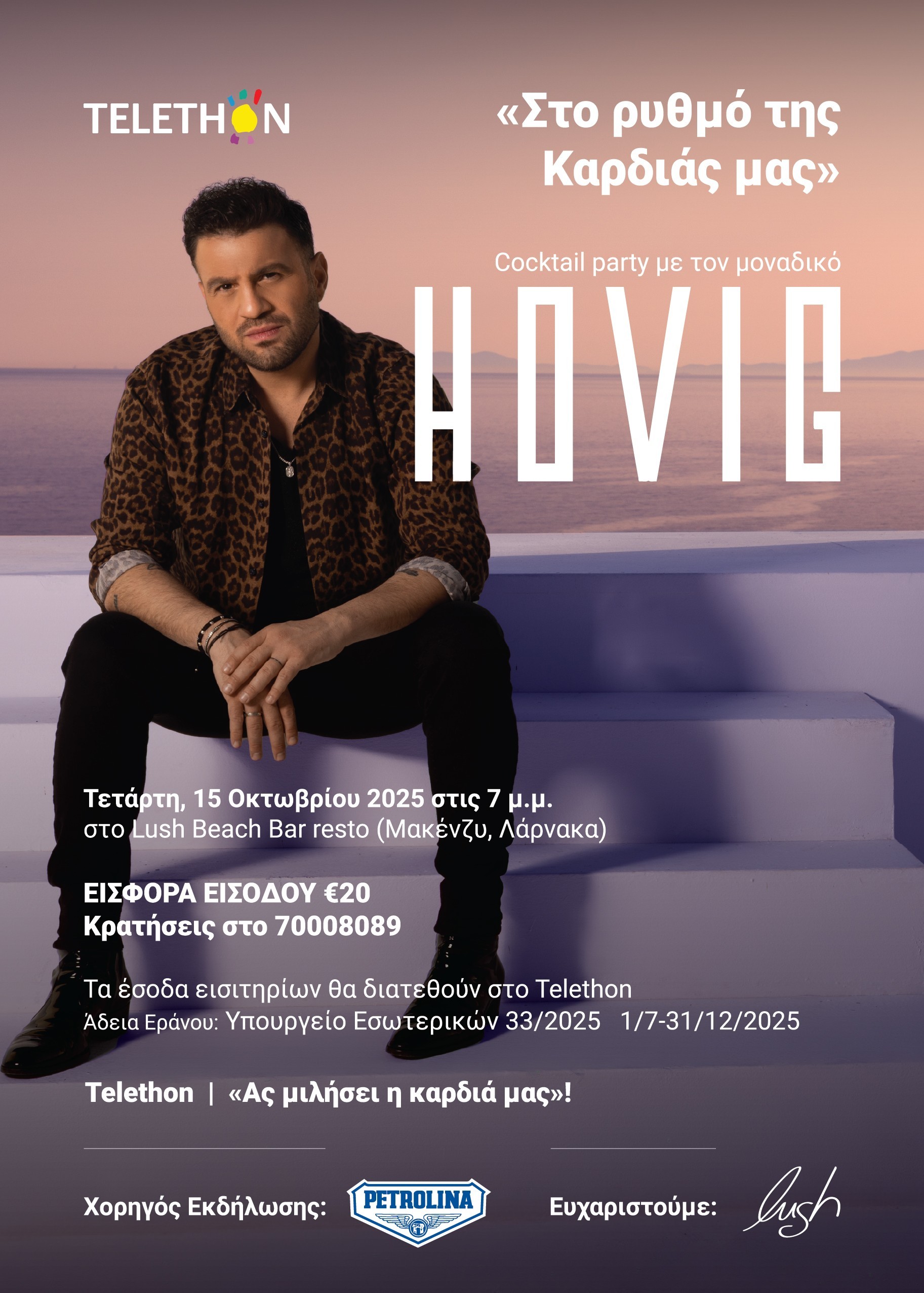 Μια ξεχωριστή φιλανθρωπική βραδιά πραγματοποιείται την Τετάρτη 15 Οκτωβρίου 2025, στις 7:00 μ.μ. στο ατμοσφαιρικό περιβάλλον του LUSH Beach Bar. Ο αγαπημένος καλλιτέχνης Hovig θα σφραγίσει την διασκέδαση της βραδιάς με όμορφες ερμηνείες!
