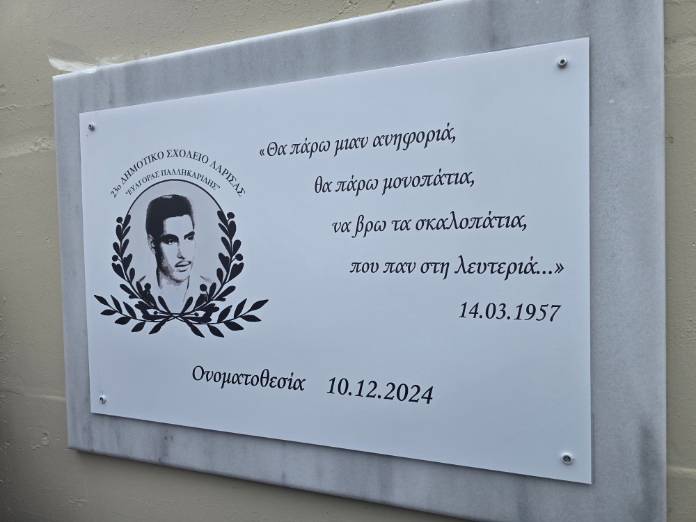 Σε μια συγκινησιακή εκδήλωση, το 23ο Δημοτικό Σχολείο Λάρισας απέκτησε νέο όνομα, τιμώντας έναν από τους πιο σημαντικούς ήρωες της Κύπρου, αλλά και όλου του Ελληνισμού, τον Ευαγόρα Παλληκαρίδη. Η απόφαση για τη μετονομασία του σχολείου από τη Διεύθυνση του Σχολείου και το Δήμο Λαρισαίων είχε ως έναυσμα την καθοριστική δράση του Σώματος Εθελοντών του SupportCY της Τράπεζας Κύπρου, που βρέθηκε από την πρώτη στιγμή δίπλα στην τοπική κοινωνία μετά τις καταστροφικές πλημμύρες που έπληξαν την περιοχή το 2023.
