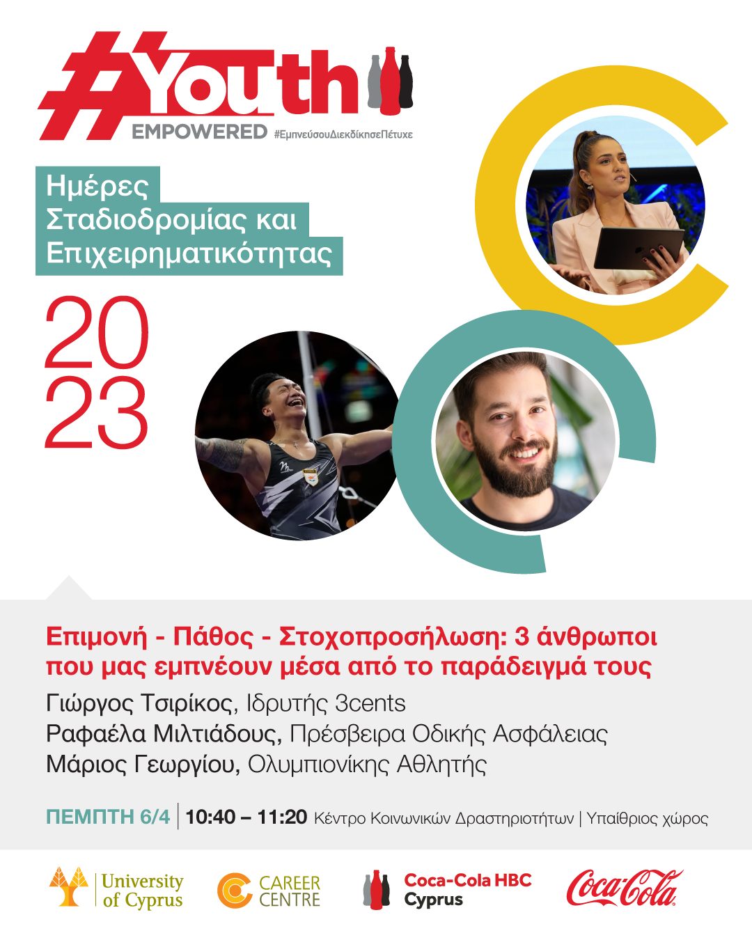Ένα διήμερο αφιερωμένο στους/στις νέους/νέες και τον κόσμο της εργασίας διοργανώνει και φέτος το Κέντρο Σταδιοδρομίας του Πανεπιστημίου Κύπρου, σε συνεργασία με την Coca-Cola HBC Κύπρου, επενδύοντας από κοινού στην εκπαίδευση των νέων, στην ανάπτυξη γνώσεων και δεξιοτήτων και στη διασύνδεσή τους με τον σύγχρονο κόσμο της εργασίας.