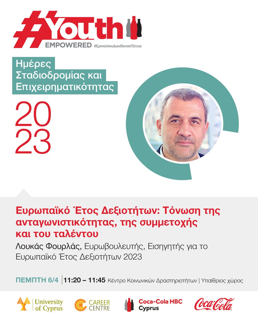 Ακολούθως, σε ένα fireside chat (11.20 – 11.45) γίνεται συζήτηση με τον κ. Λουκά Φουρλά, Ευρωβουλευτή και Εισηγητή για το Ευρωπαϊκό Έτος Δεξιοτήτων 2023, για το πώς το Ευρωπαϊκό Έτος Δεξιοτήτων θα βοηθήσει το ανθρώπινο δυναμικό να αποκτήσει τις κατάλληλες δεξιότητες για ποιοτικές θέσεις εργασίας και τις επιχειρήσεις να αντιμετωπίσουν τις ελλείψεις δεξιοτήτων στην Ευρωπαϊκή Ένωση. Τη συζήτηση συντονίζει η κ. Ιουστίνη Πηλείδη, Επικεφαλής Λειτουργός στο Γραφείο Σταδιοδρομίας, στο Κέντρο Σταδιοδρομίας του Πανεπιστημίου Κύπρου.