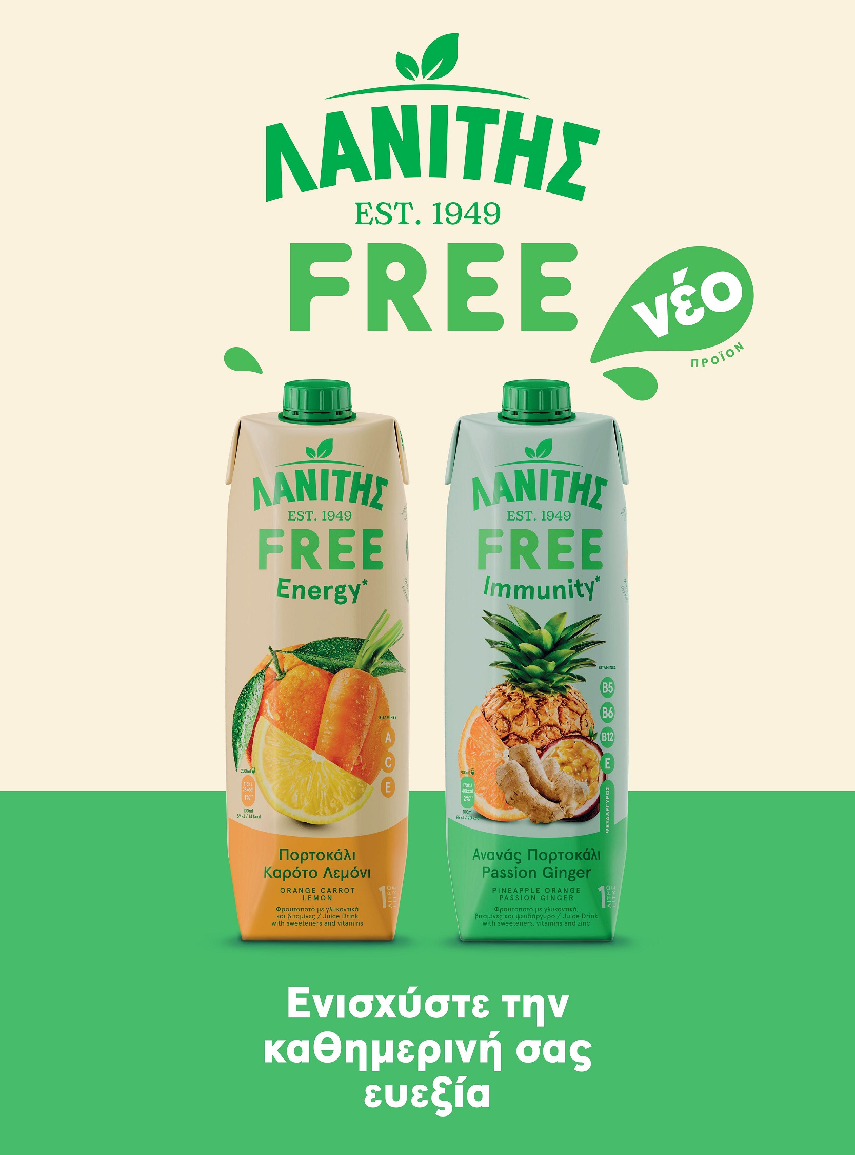 Η νέα σειρά χυμών ΛΑΝΙΤΗΣ FREE, έρχονται σε συσκευασίες 1 λίτρου και 330ml που ξεχωρίζουν για τον ιδιαίτερο σχεδιασμό τους, σε 2 υπέροχες γεύσεις: