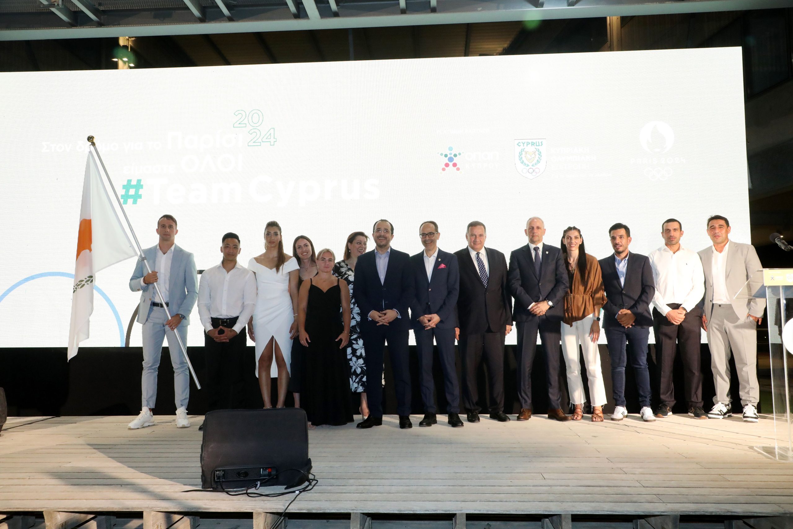 Σε τιμητική εκδήλωση που πραγματοποιήθηκε το βράδυ της Παρασκευής (14.6.2024) στον υπαίθριο χώρο του Ολυμπιακού Μεγάρου οι πρωταθλητές μας εξέφρασαν την αισιοδοξία τους για την αγωνιστική τους παρουσία στους Ολυμπιακούς Αγώνες και βεβαίωσαν ότι θα σηκώσουν ψηλά τη σημαία της Κύπρου. Τη σημαία παρέδωσαν στους αθλητές ο Πρόεδρος της Κυπριακής Δημοκρατίας, η Υπουργός Παιδείας, Αθλητισμού και Νεολαίας, Αθηνά Μιχαηλίδου και ο Πρόεδρος της Ολυμπιακής Επιτροπής Γεώργιος Χρυσοστόμου.